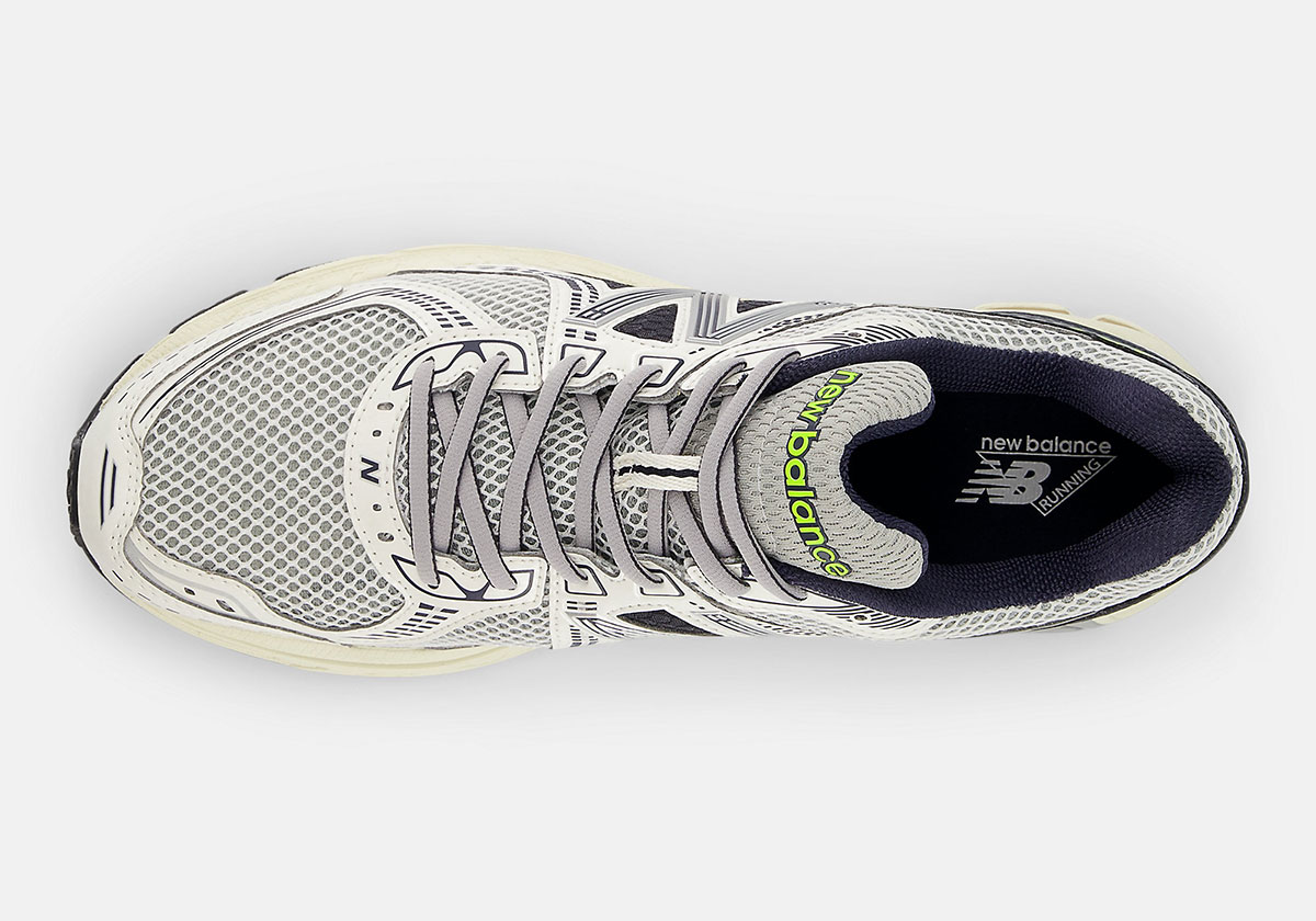 Official images reveal cream-colored mesh over the toe box and collar sections, accompanied by navy blue treatments on the quarter window and lining. Cream leather overlays work in navy and metallic silver detailing up front, while the heel panel favors a navy backdrop. Grey mesh lives on the tongue, matched by grey laces with navy edges, while small pops of neon green appear on the tongue and lateral heel branding. Underfoot, a pre-aged cream midsole and black outsole round out the delivery.