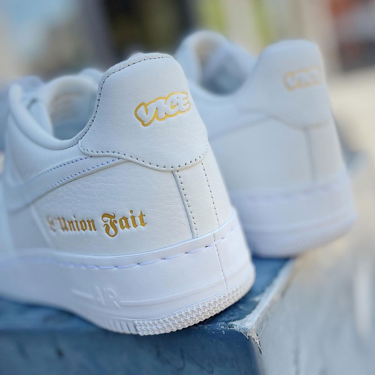 The design comes from the same school as Drake’s “Love You Forever” Air Force 1, defined by subtle upgrades to an all-white premium leather base. Gold “Vice” branding is matched by old english typography reading “L’Union Fait la Force” (Unity is Strength) on the heel, an ode to the company’s roots in French-speaking Quebec. As a “CMFT” Air Force 1, the shoe also features an upgraded outsole that’s broken up into two pieces, with oversized Vice branding taking to the inner portion.