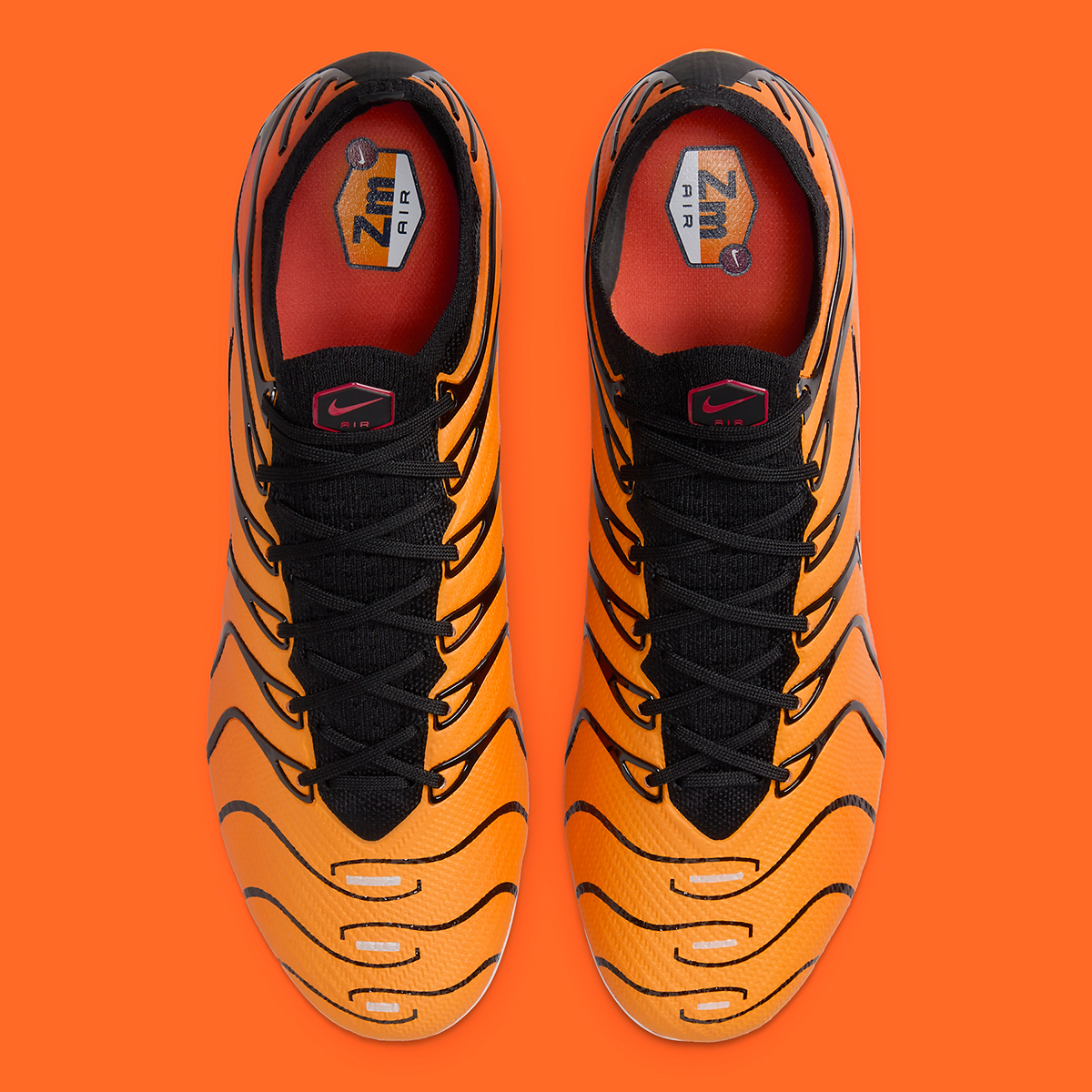While the light orange to deep red gradient is both the most full-throated and most obvious way that these run counter to the Plus, it isn’t the only nod. The webbed, structural ribbing that marks each Plus release makes its way to these cleats, giving the model a genuine formal makeover as a result. Though at first glance it’s a one-to-one reproduction, that wavy design appears a graphic overlay towards the toe, keeping their sleek, performance-mindedness intact.