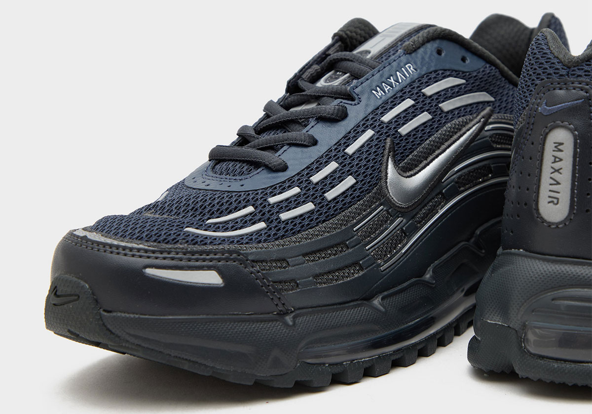 Official retailer images show a dark grey colorway featuring navy blue mesh up top; a rather low-key take on the running-turned-lifestyle cut. Scattered “Metallic Silver” accents appear on the Swoosh logos and upper TPU detailing for some welcome visibility, while a grey midsole featuring a blue Air unit lands underfoot.