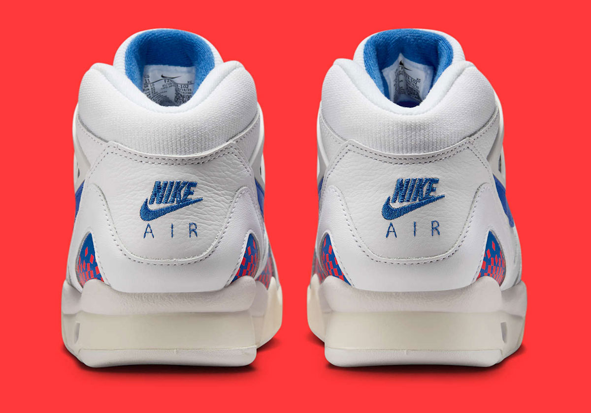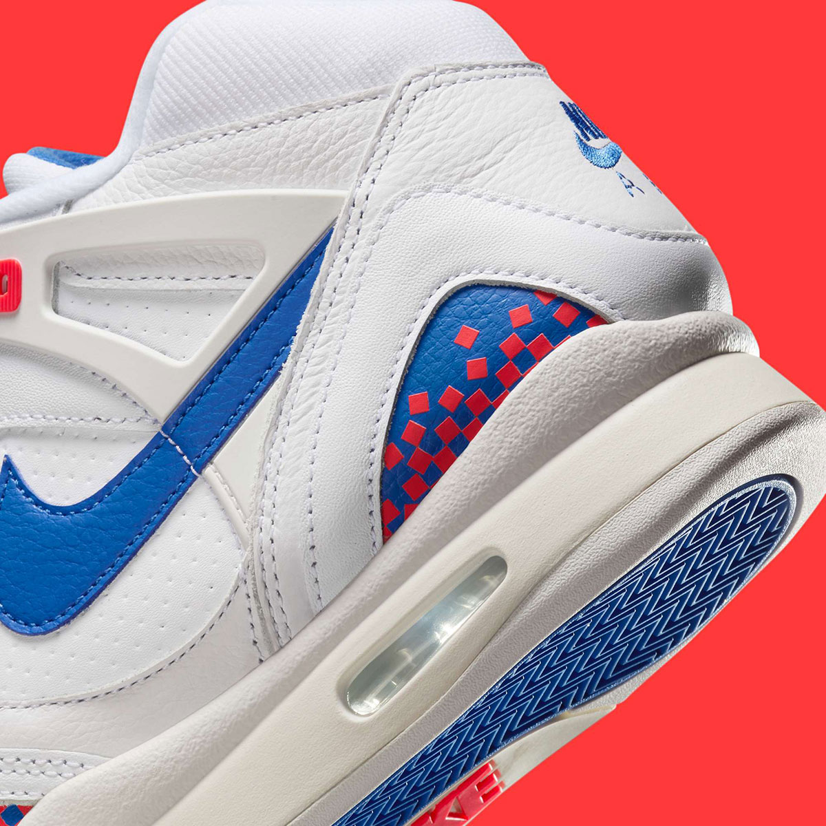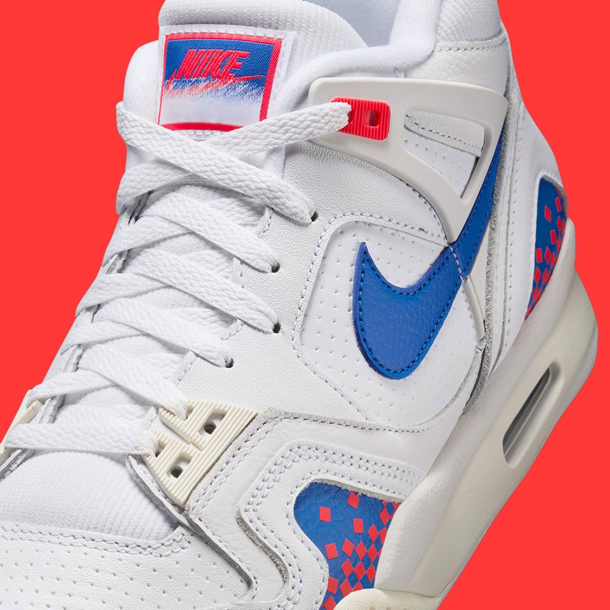 Last seen in 2014, the “Pixel Court” Air Tech Challenge II stands out with distinctive red cubes within the mudguard windows. Just like all other modern releases, pre-aged treatments are applied to the midsole and lower eyestay. The model’s intricately-layered base cleans up in white leather, while the Swoosh, inner tongue, and heel “Nike Air” text all come in blue.