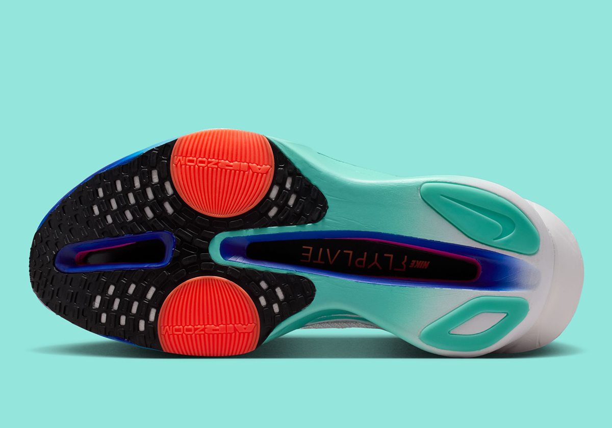 The Nike AlphaFly 3 is here presented in “Neo Turquoise” makeup for Holiday 2025, starting with a white Atomknit upper featuring a black Swoosh. As is true for the model itself, the midsole is where things get interesting. The central ZoomX foam structure fades from dark to light blue from heel to toe, while the forefoot Air Zoom window introduces small splashes of orange and hot pink.