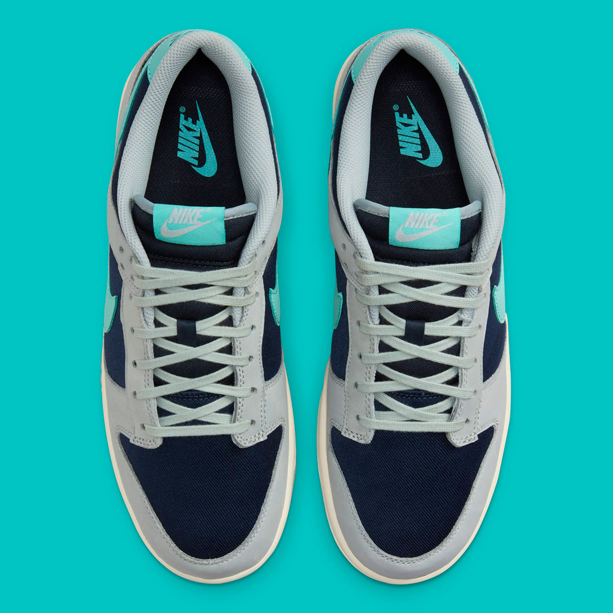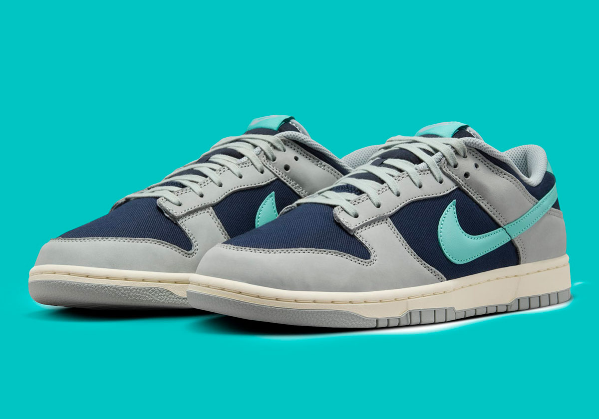 The grey & navy combination that sets the tone early for this pair is easily recognizable, a choice we’ve caught before on models from the Jordan 6 to the Vomero 5. Given that, Beaverton designers made a few changes in the margins to breathe some new life into the latest Dunk drop. For one, an off-white midsole proves again to be a successful choice, imparting some vintage appeal. That’s only emphasized by the switch to durable denim on the underlays. Departing from that category, the teal Green Frost sections (the Swoosh & tongue tag primarily) is impactful in bringing sprightly energy because it’s so stark compared to the rest of the profile.