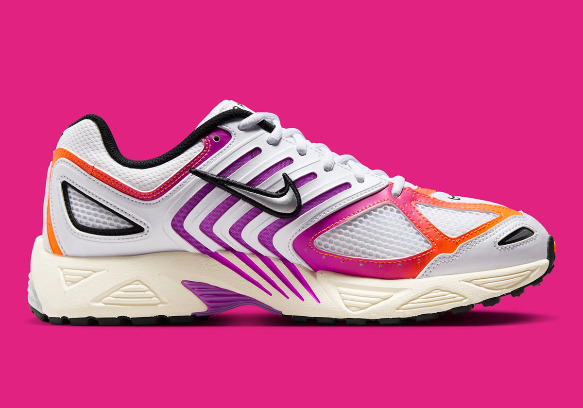 As its nickname suggests, the design revolves around a full-length orange/purple sunset gradient that spans the lowermost overlays, peeking behind the ribcage-inspired cage at the quarter. Maintaining focus on that area, the ribbed pattern that begins up top bleeds down into the midsole a la Air DT Max 96, introducing a continuous splash of purple underfoot. Metallic silver Swoosh logos add even more flair on the cage and forefoot, while the rest of the upper presents in black and white so as to keep the gradient the focal point. In adding a slight vintage feel, the midsole comes painted in sail to complete the delivery.