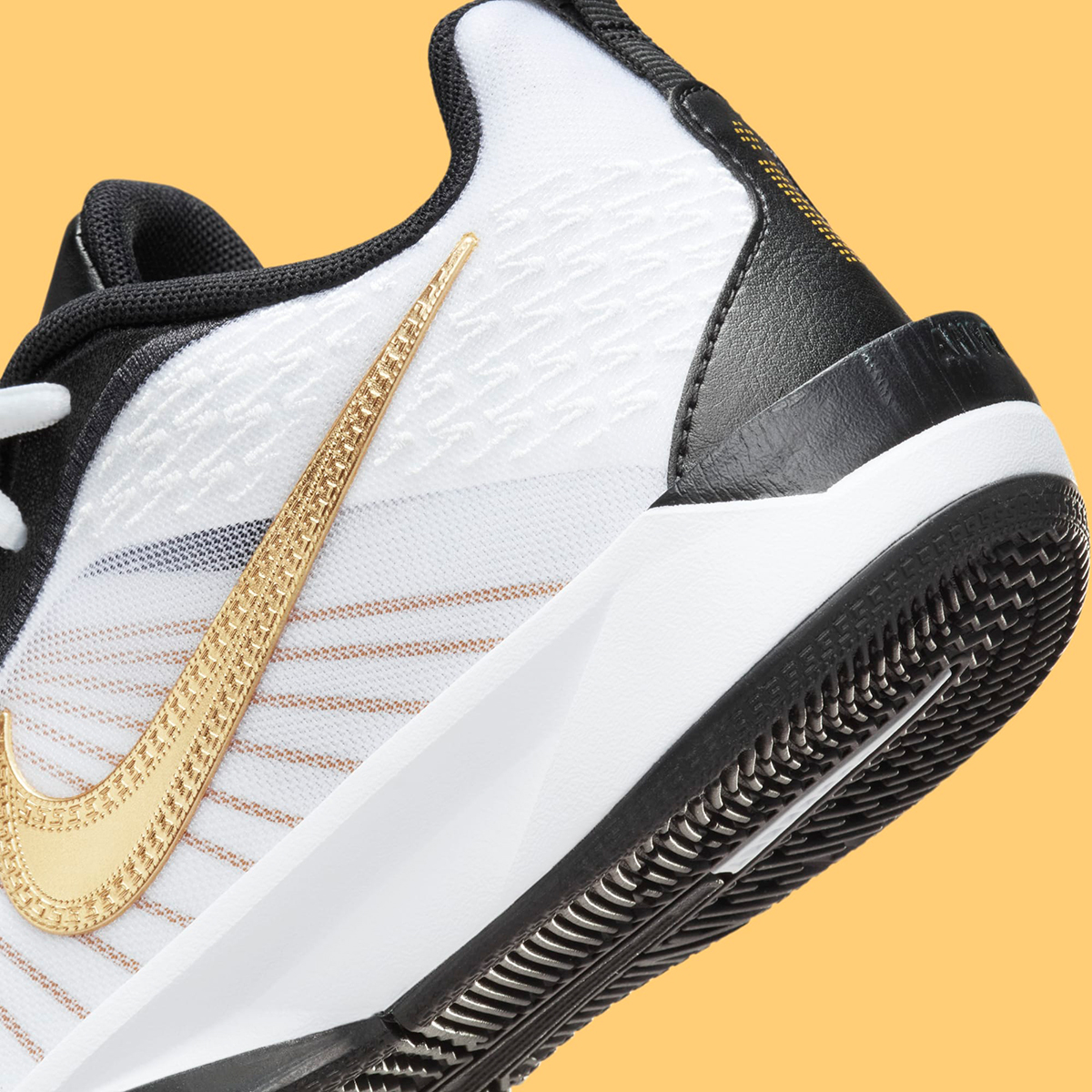 Synthetic mesh at the quarter panels does the same, the sheer white coloring again showcasing the FlyWire anchoring tech that led to so many comparisons to the Nike Kobe 5. Emblazoned gold accents on the medial & lateral Swooshes and the tongue tag close out this look with some serious pedigree, exceeding by greatly livening up an otherwise monochromatic outfit.