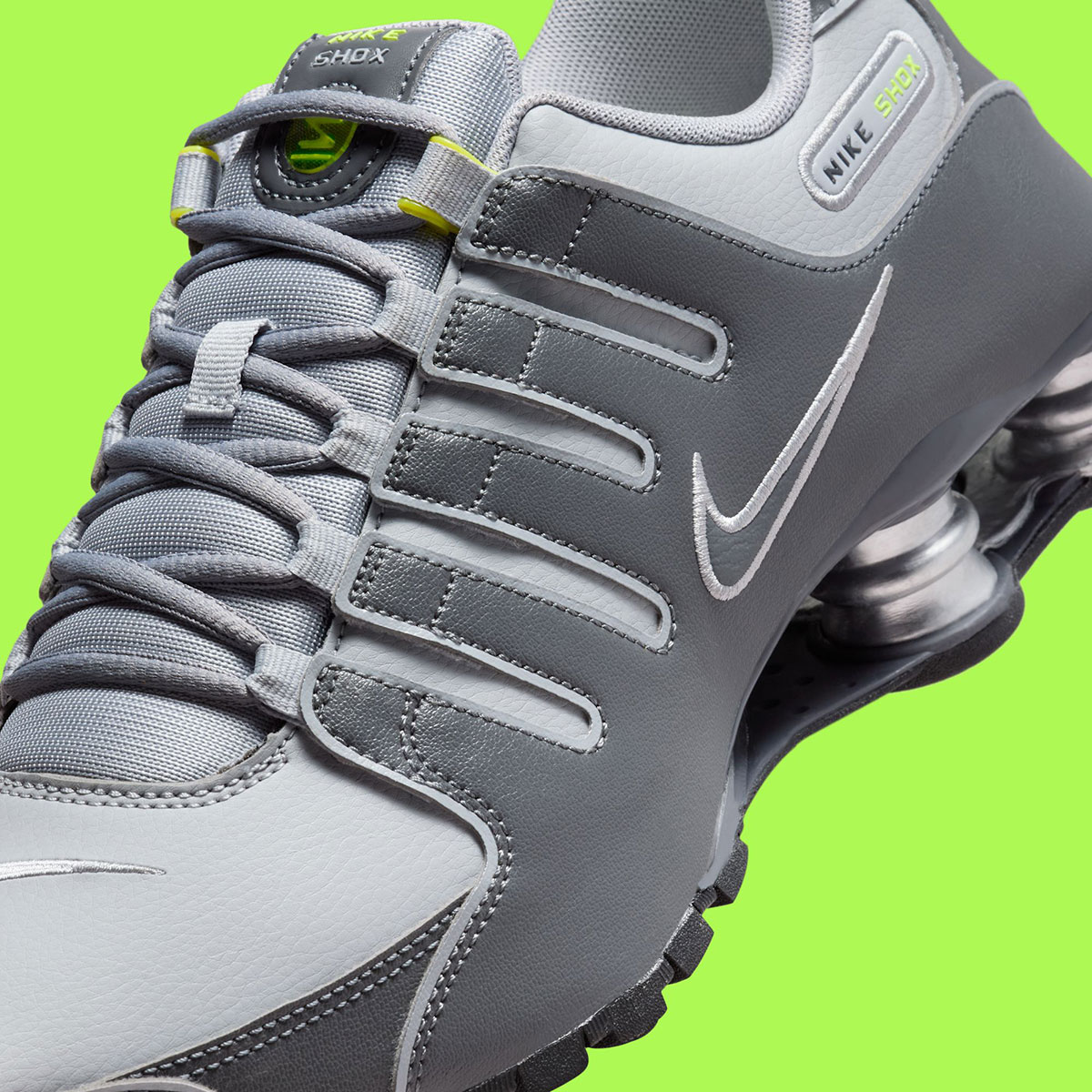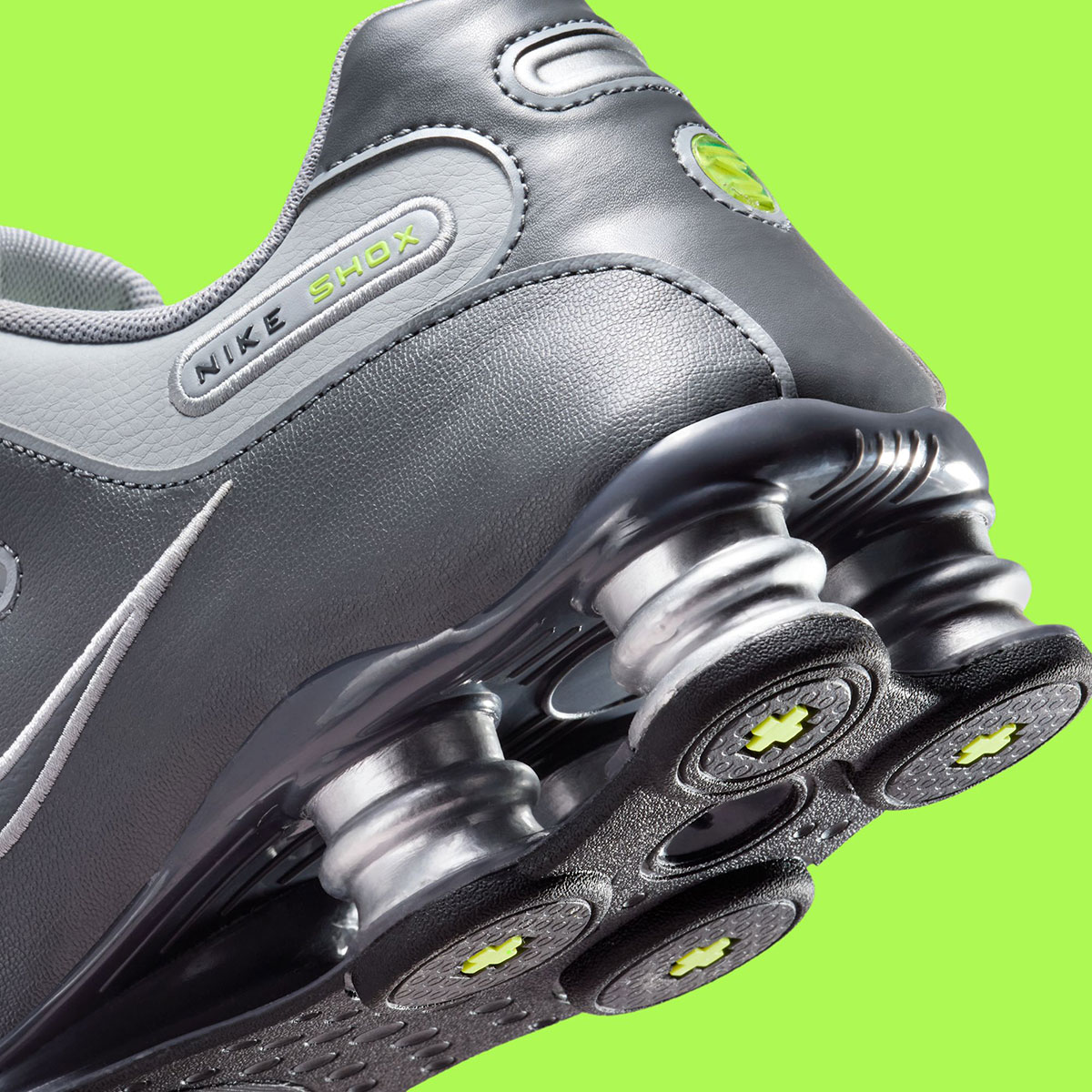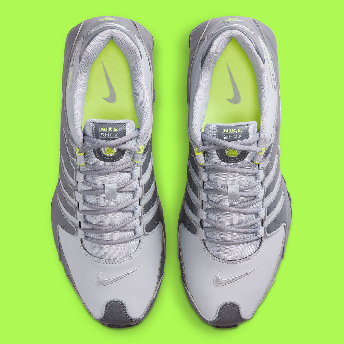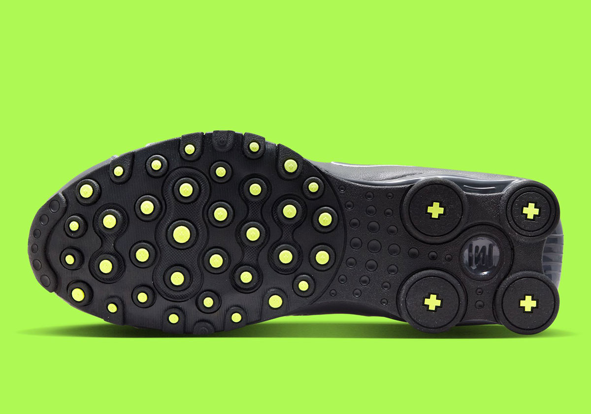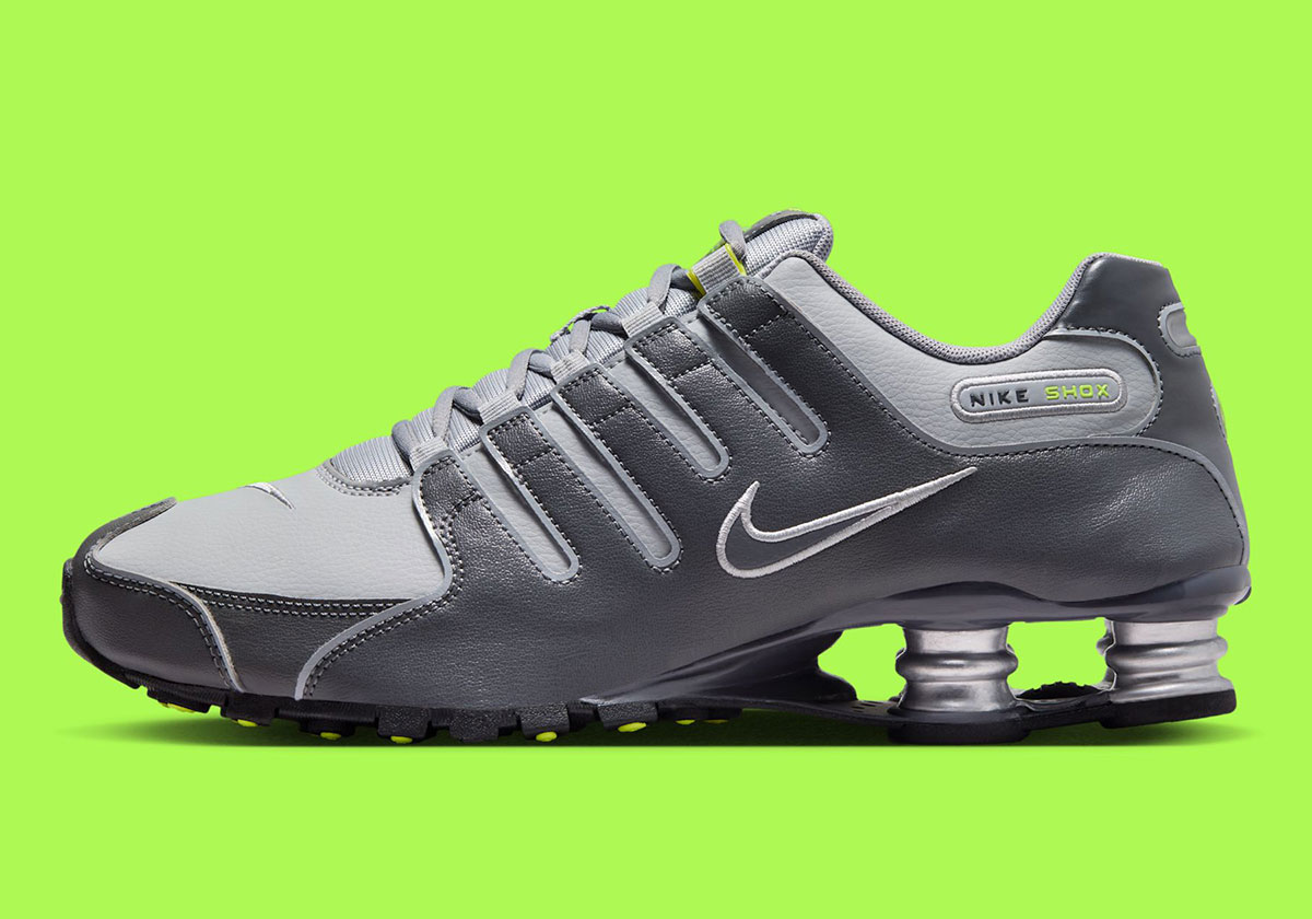 A quick Google search reveals a handful of old eBay listings for this specific arrangement — a familiar one in the realm of Nike running sneakers. Sharing a palette comparable to the Air Max 95 “Neon,” the Shox NZ here features a “Wolf Grey” leather base, “Dark Grey” side paneling, and “Volt” hits on the insoles, tongue, and other branded elements. The Shox columns at the heel appear with a metallic silver finish, followed by a black outsole underfoot.