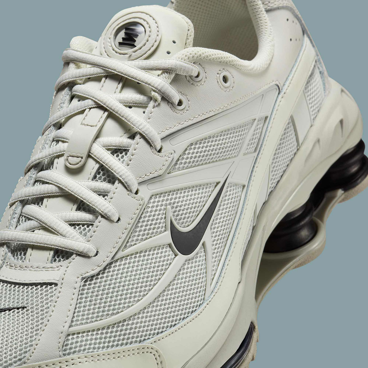 Striking a low-key note, this upcoming colorway comes almost entirely in “Light Bone” with black accents on the Swoosh and Shox cushioning. Focus is therefore heightened on the models quirky tooling, with elaborate TPU/leather layering catching the eye up top. Two key Nike Running innovations make for all-day comfort underfoot; Shox in the heel and Zoom Air in the forefoot.