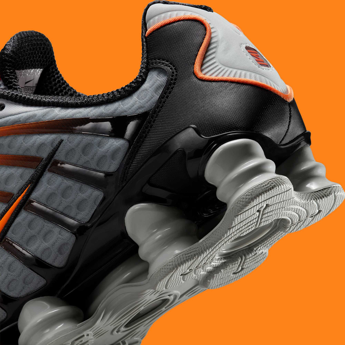 Eyes are first drawn to a “Bright Mandarin” Swoosh, which is mirrored by a fade-to-black gradient on the TPU overlays. Patterned synthetic material rests one layer down, and the joined toe box/tongue is comprised of breathable mesh. Underfoot, the boingy Shox cushioning pillars unite in “Light Smoke Grey.”