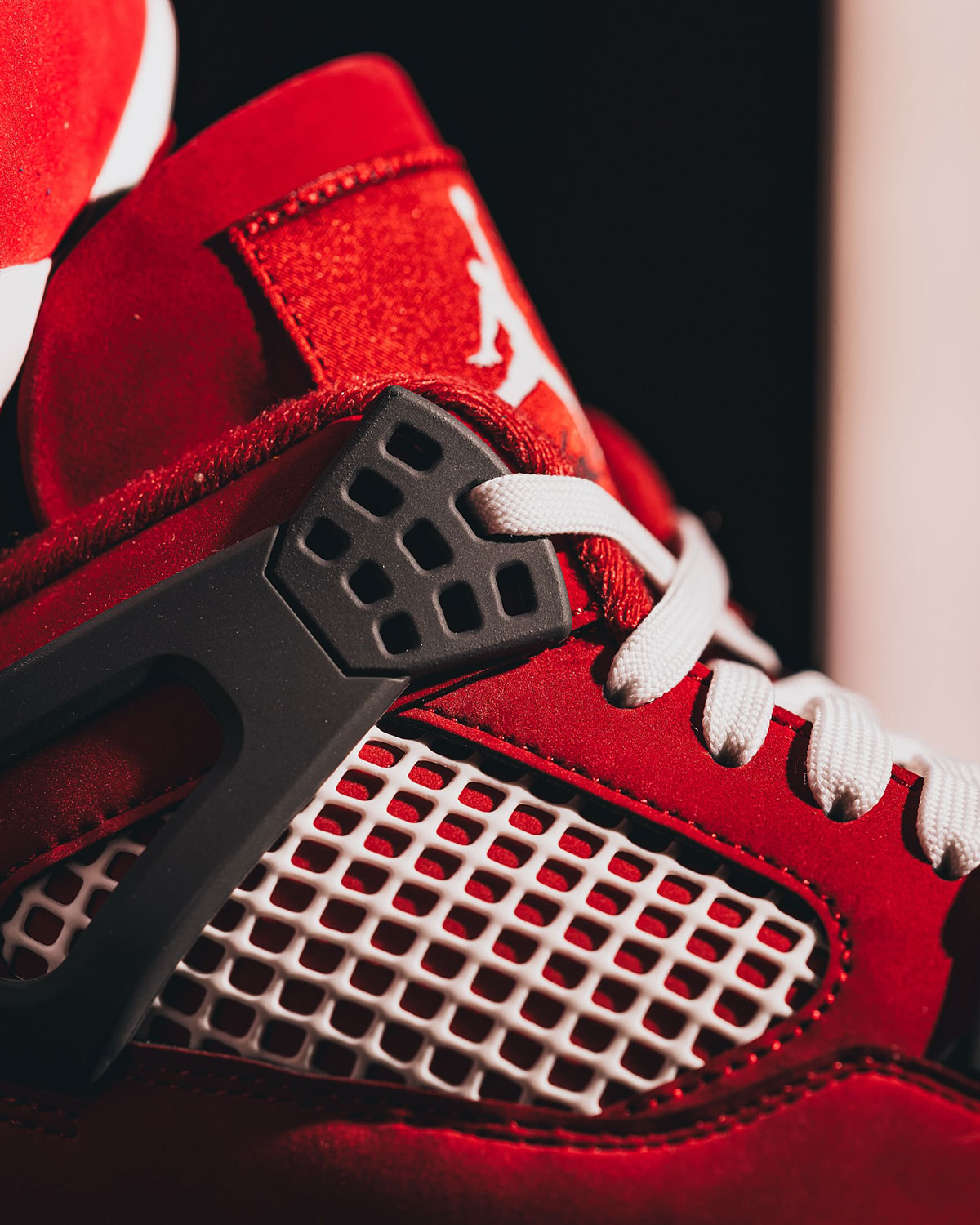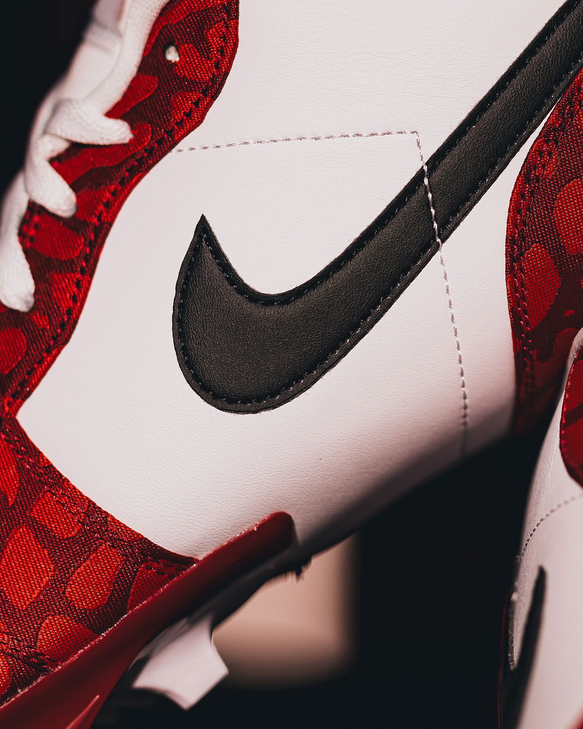 It’s much the same as the wave of college basketball Air Jordan 4 PEs we saw in the early goings of 2025, in which schools from Marquette to UNC to Houston enjoyed the fruits of Kelsey Amy’s labor. Each of those exclusive kicks bore the same color blocking and material makeup, only with the trademark colors swapped out. Again, that’s what we’re seeing build with these gridirion counterparts; Oklahoma gets their own editions of cleated Air Jordan 1 Lows and Air Jordan 4 ; the former simply sports a mix of red and white, while the latter gets a bit more inventive with luxe animal prints across the overlays. To ensure Sooner pride is felt on foot, OU brands sit on the tongue of either pair.