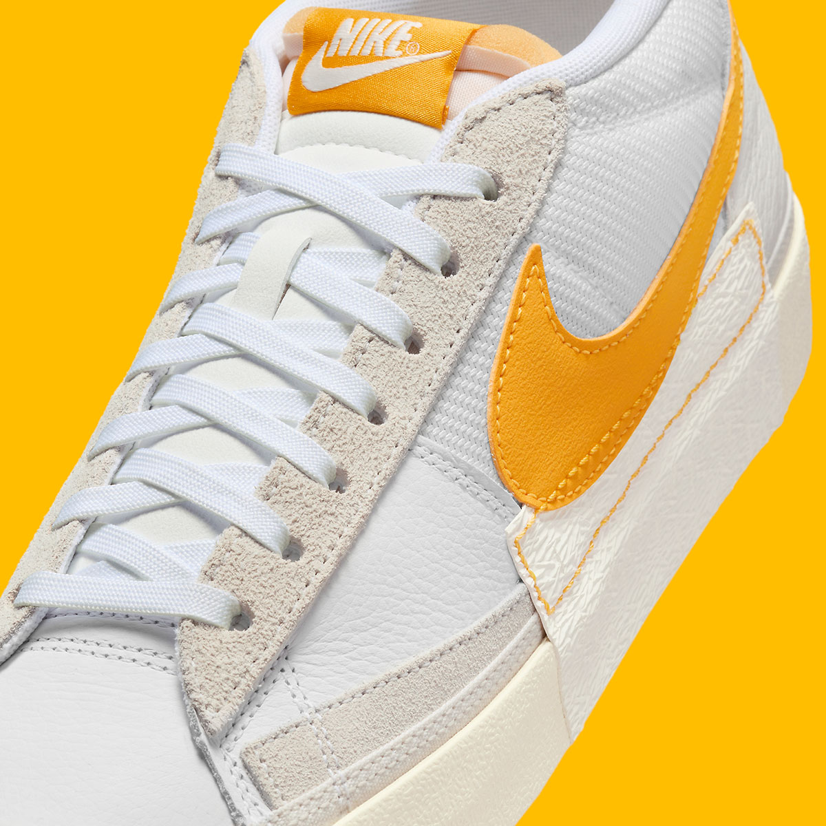 This is a microcosm of a frequent Nike strategy with offshoot models. Rather than continue experimental design in the palette, this shoe opts for a more conservative white & yellow layout, only interrupted by an off-white midsole and grey suede eyestays. It allows the out-of-left-field construction to speak for itself, and easier fit into consumer wardrobes than if it opted for a wilder color swatch. All the same, the added rubber swatch, modified foot entrance and exposed foam tongue carry enough to stand out from the mainline Nike Blazer.