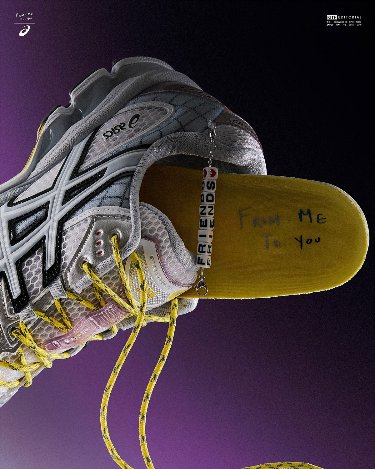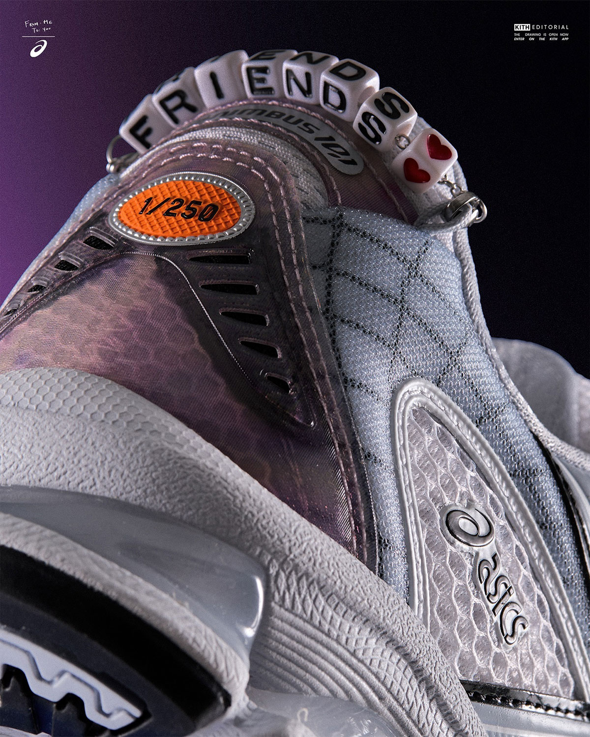 In case you missed out on our original coverage, the sneaker in question doubled as our first look at the GEL Nimbus 10.1 model, combining the upper of 2008’s GEL.Nimbus 10 with the sole unit from the ever-trendy GEL-Kayano 14. Diggs’ vision is executed on the shoe with a slew of special edition touches. He widens the underlying mesh, adds curved grid patterns that run across the full profile, and pitches in literal friendship bracelets that click onto the collar to double as a pull tab. “Friends” type on the tongue match that atmosphere, and a “1/250” emblem at the heel reinforces just how special each of these pairs are.