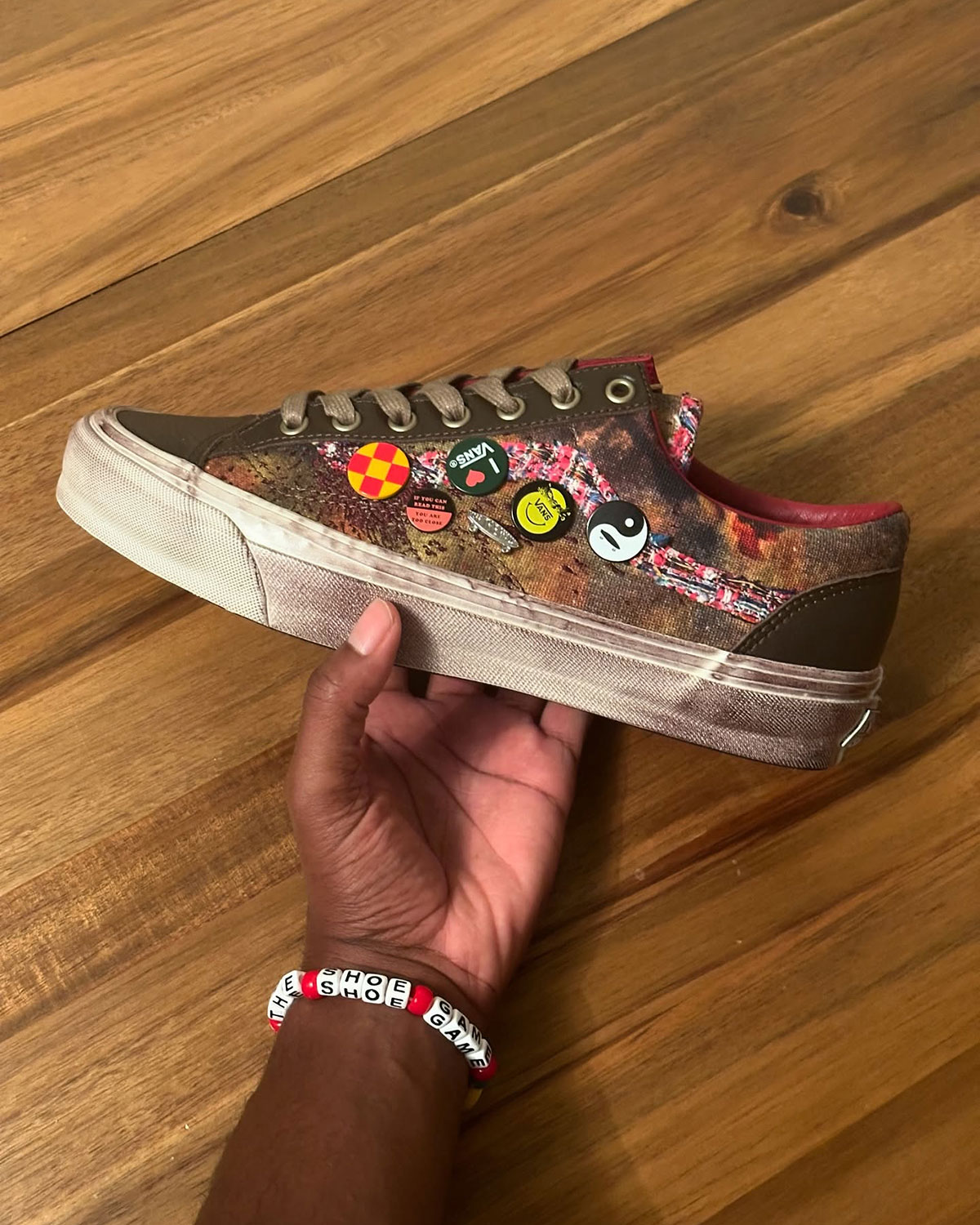 To peel back the narrative here for those who haven’t spotted these yet, the Vans Old Skool 36 “Souvenir” is a tacit yet rather bold reference to the “Graffiti” Chanel On The Pavement Messenger bag. True to that style, frayed multi-color embroidery drapes the sidestripe here, while its leather straps and buckles inspire the toe-cap, heel cup, liner, and eye-lets. Vans pints allude to the “summer of love” style patches on the OG, and serendipitously align with currently trending charm aesthetics.
