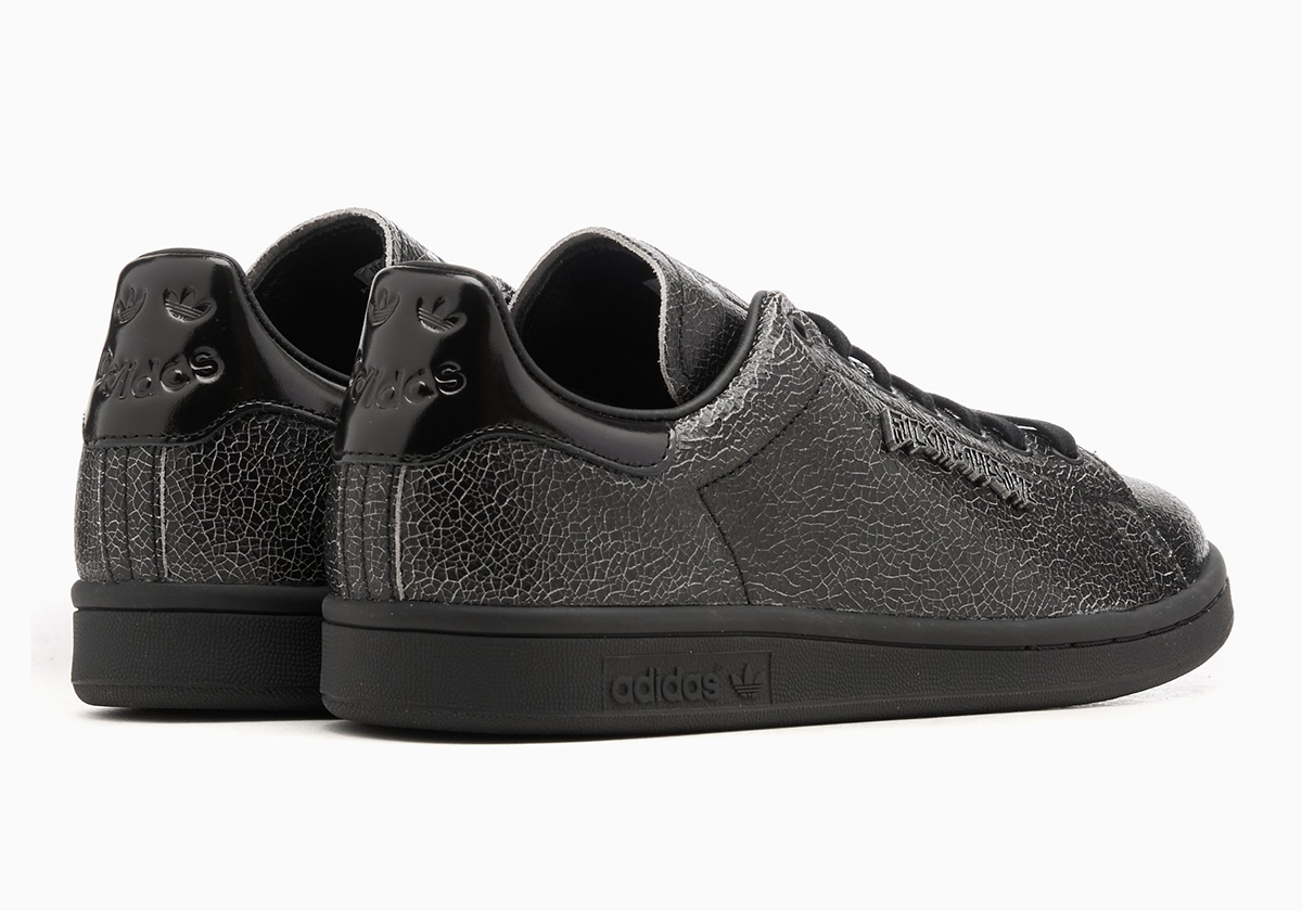 The connections between this all-black edition and that quartet of looks from the turn of the decade go deeper than just the model at play. From that inaugural link-up on the tennis staple, the removal of the Three Stripes perforations at the quarter and subsequent replacement with a metallic Fucking Awesome stamp remains the center of this Stan Smith design. As does the one-note tonal palette, of course swapping from bright accent shades to the stealthy one seen here. From there, slighter changes like the crackled texture of the leather foundation, a swap back to the typical rear panelling rather than the askew interpretation from 2019, and a patent leather heel cup complete this fresh make-up.