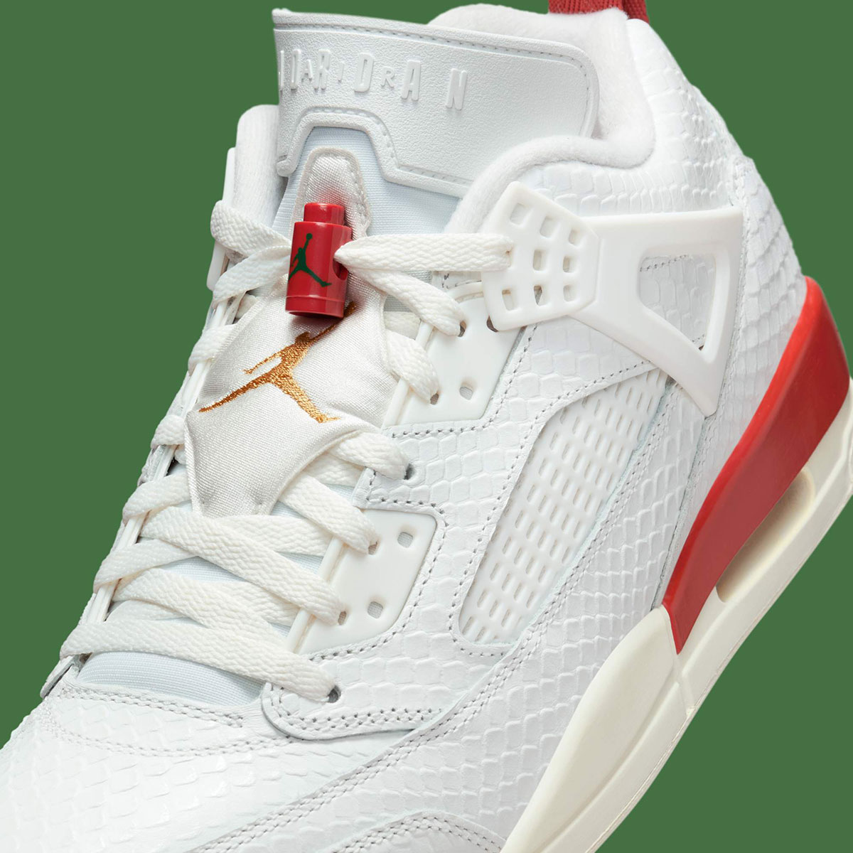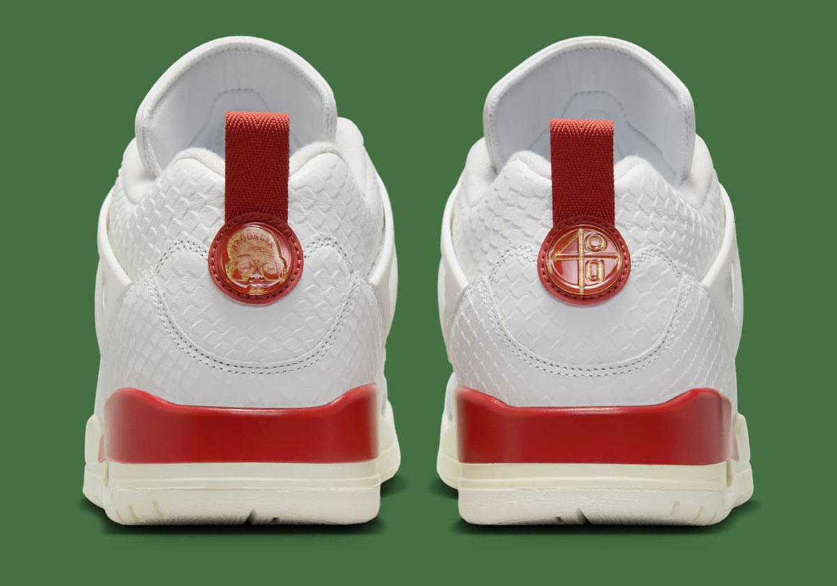 Official images reveal a full “Summit White” leather exterior, taken with a scaly, reptilian texture akin to snake and croc skin. “Pine Green” Jumpman logos appear over “Dragon Red” on the lace locks and insoles, while “Metallic Gold” hits on the tongue cover and Spike Lee-branded backtabs round out the palette.