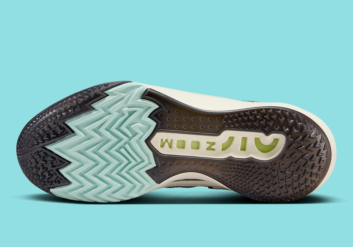 Mixing its mesh upper between black and light blue hues, the pitch-dark treatment begins to concentrate along the inner lining and the serrated heel counter as the tongue and heel tab pair off for a “Jade Ice” compliment. Striking the laces with a more vibrant “Mineral” treatment, both the midsole and profile swooshes are cast in a subtle “Pale Ivory” accent. While specific details surrounding the anticipated cohort of silhouettes have yet to be disclosed, the tongue tabs bubbled appearance – that depicts reworked Nike Basketball brandings dipped in a neon volt hue – signals a recurring theme in the future.