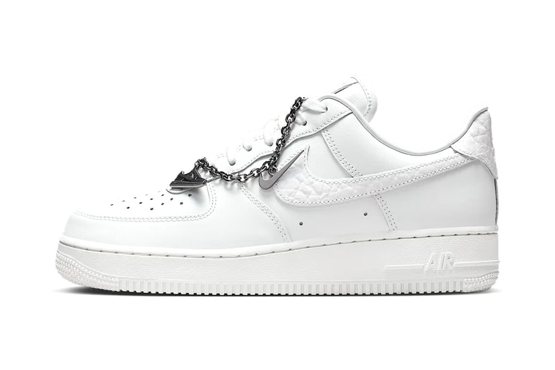 The upcoming model looks like a traditional Air Force 1 at first glance, complete with the silhouette's all-white leather uppers. A closer look will reveal, however, textured tumbled leather on the panel swoosh, tongue tag and heel, adding a subtle alteration. More branding lands on the tongue tag, insoles and debossed Nike Air heel logo. Just like the original, the shoe rests on a white Air midsole and outsole, while white laces tie them together for a polished finish. A metallic lace chain with swoosh and AF1 charms elevate the clean aesthetic, ultimately paying homage to and recognizing itself as an icon.