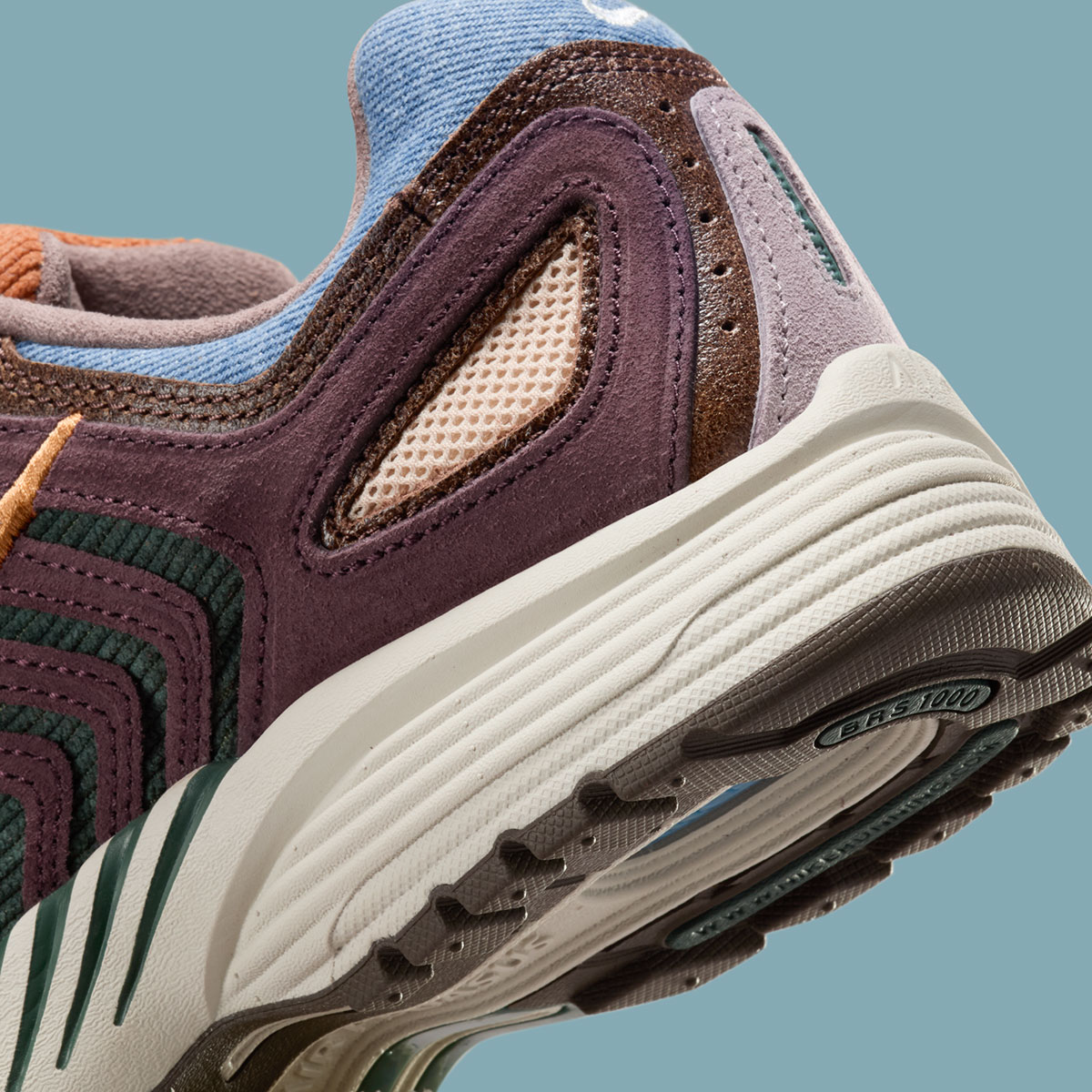 Outside of beige mesh at the very base layer, nearly every additional section over top is given some sort of material refresh. The collar appears in blue jean denim, the cut-out medial cage is instead executed in suede, the weaving brown leather overlays take to textured leather and corduroy peeks through at the tongue and quarter panel.