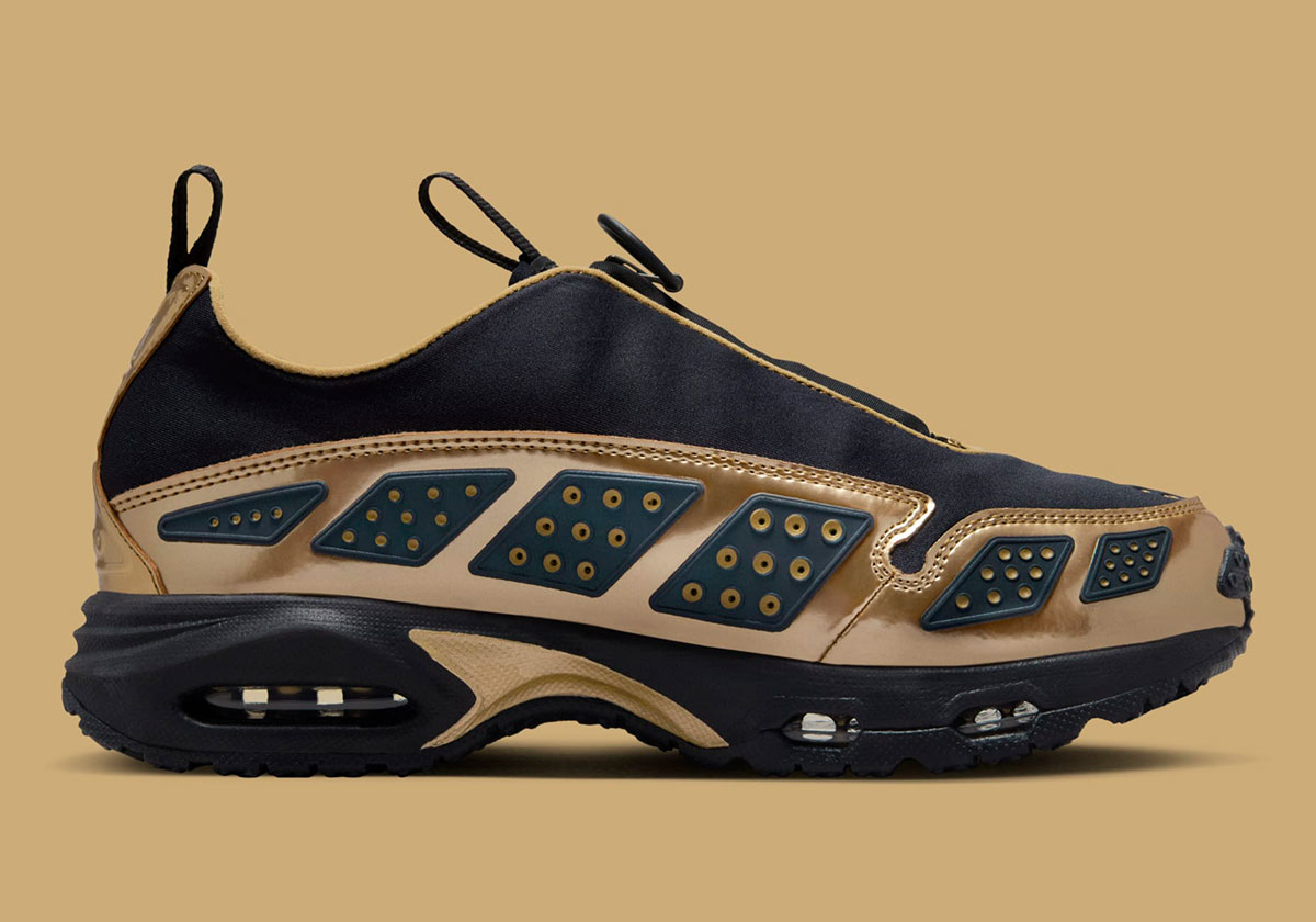 Here’s a look at the Nike Air Max Sunder “Metallic Gold”, featuring a metallic overlay above a black base. There’s always an attitude of elegance that comes attached with the shiny material, and the Sunder’s no exception despite its edgy appeal and Nike’s marketing efforts attempting to speak to the younger, Y2K fashion crowd. This “Metallic Gold” is just one of several Air Max Sunder colorways that are due out this Holiday season, all of which seem to be made in women’s sizing.