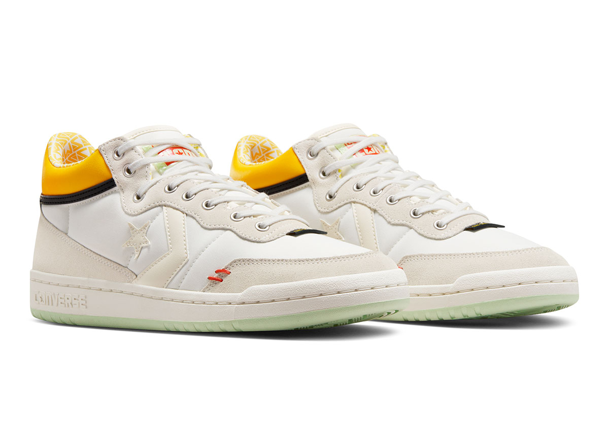 A co-signed take on the Converse Fastbreak completes the trio, best defined by its yellow collar and matching pattern on the sock liner right next to it. A green outsole and forefoot tag reading “Qué Sabrosa!” (Yummy!) add to the look, but a white leather base and grey/off-white overlays keep it tame.