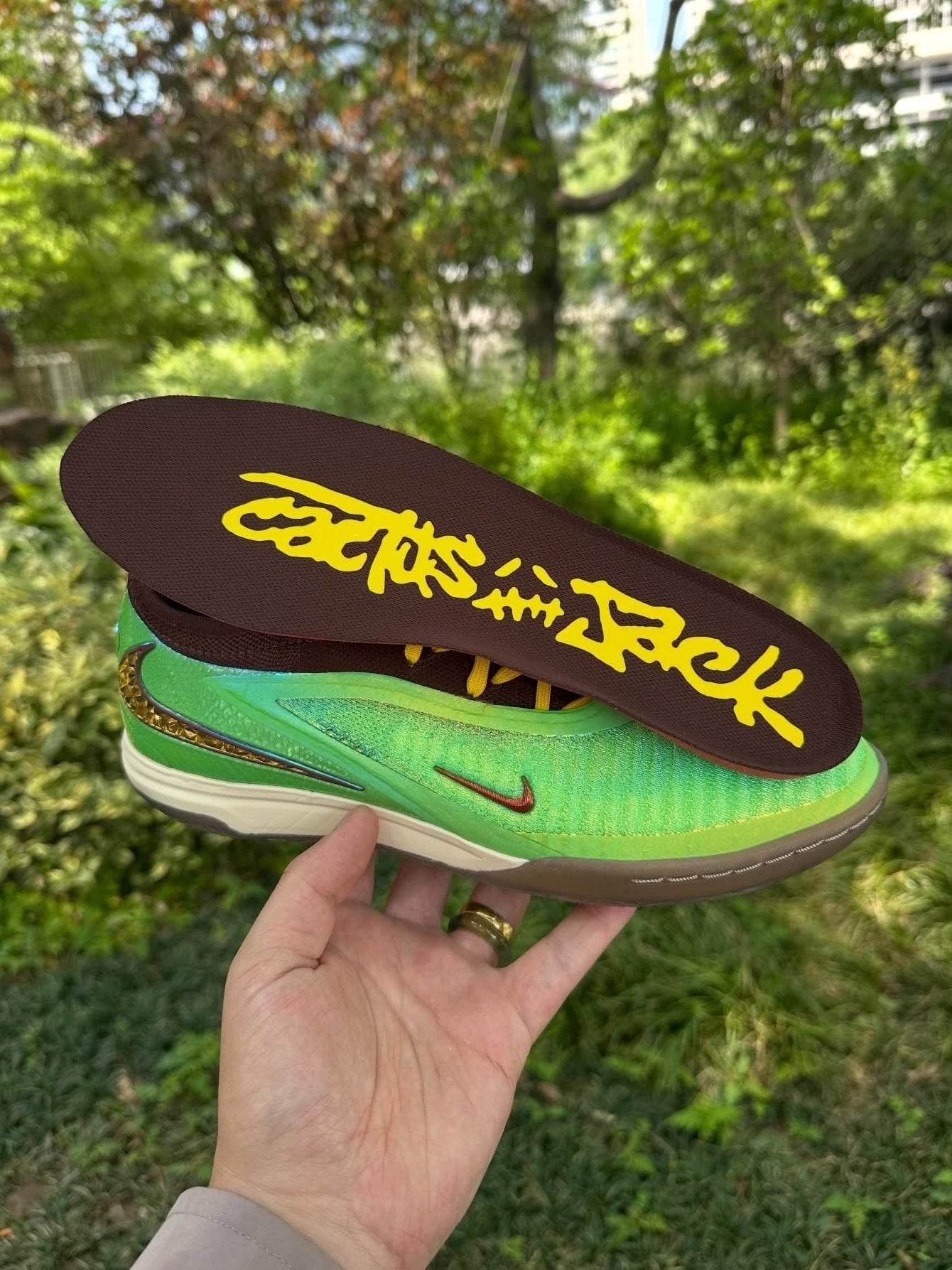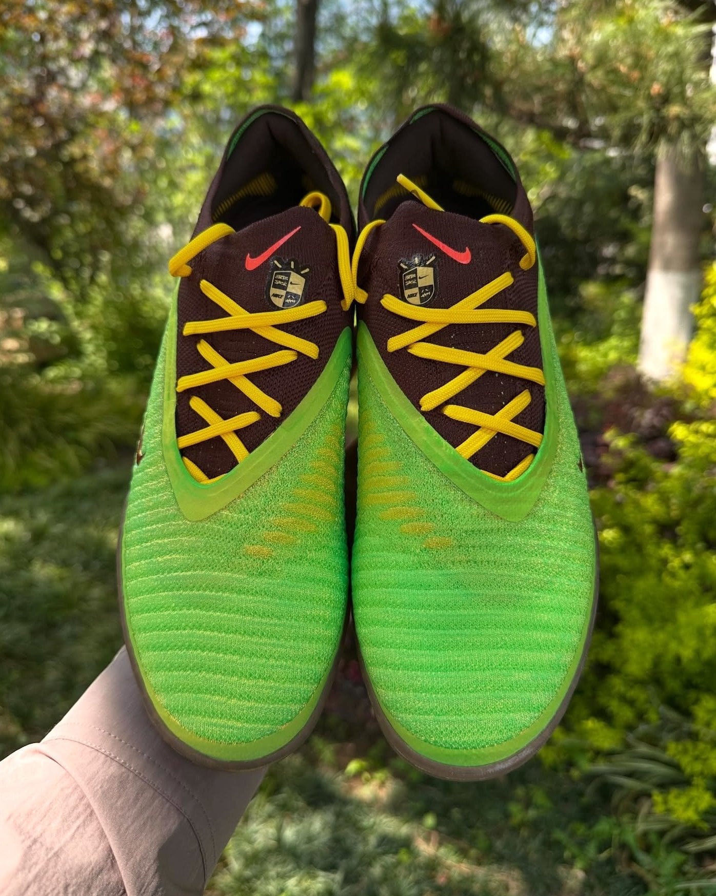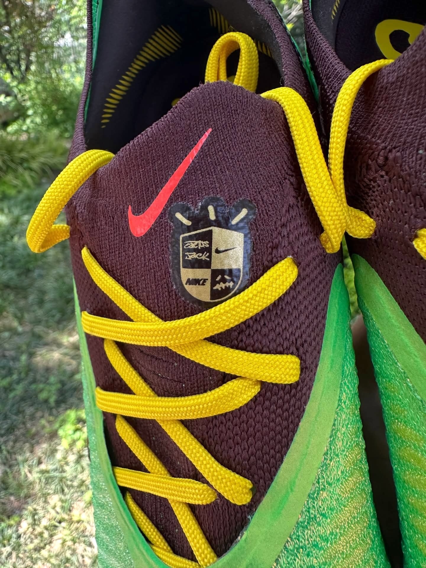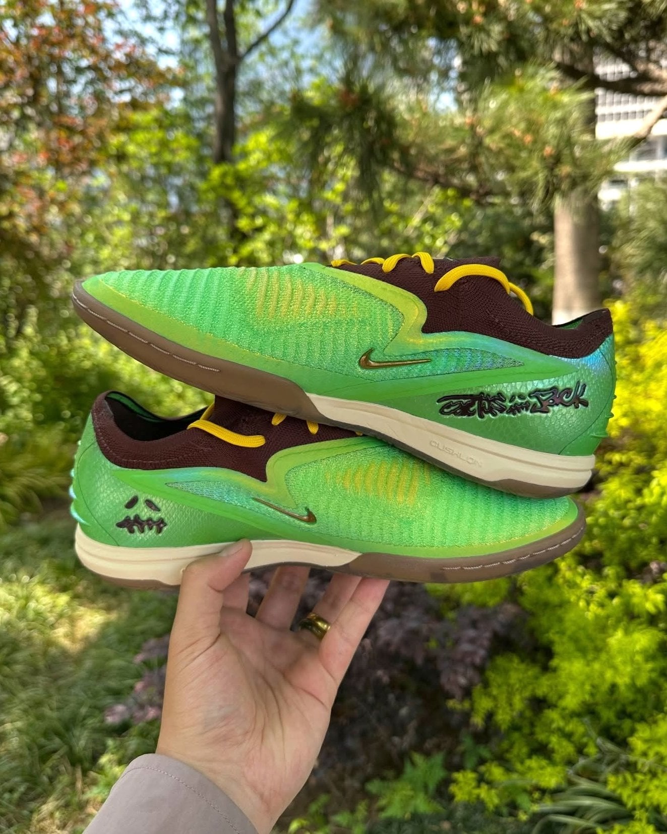 UPDATE 4/27/26: Travis Scott’s upcoming soccer shoe collaboration with Nike has resurfaced this month, after first appearing back in December. The Phantom 6 Indoor boot is seen below in new in-hand images, showing off a bright acid green upper with brown and yellow accents. Plenty of Cactus Jack branding is added throughout the shoe, which is expected to release this Summer for the World Cup.