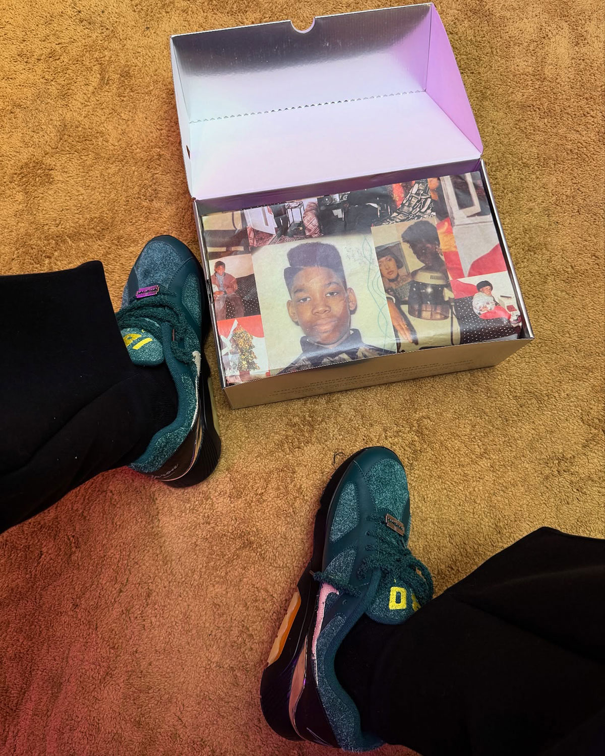 Attempting to trace back the narrative, record label founder partially formed his love for music by working in his aunt’s salon, an early passion that prompted him to get a razor blade tattoo in his hand. Clearly that “genesis” moment partially lights the shoe featured here, displaying a straight razor on the front of the lace unit. Julien additionally posted a guide comb in these initial teaser shots.