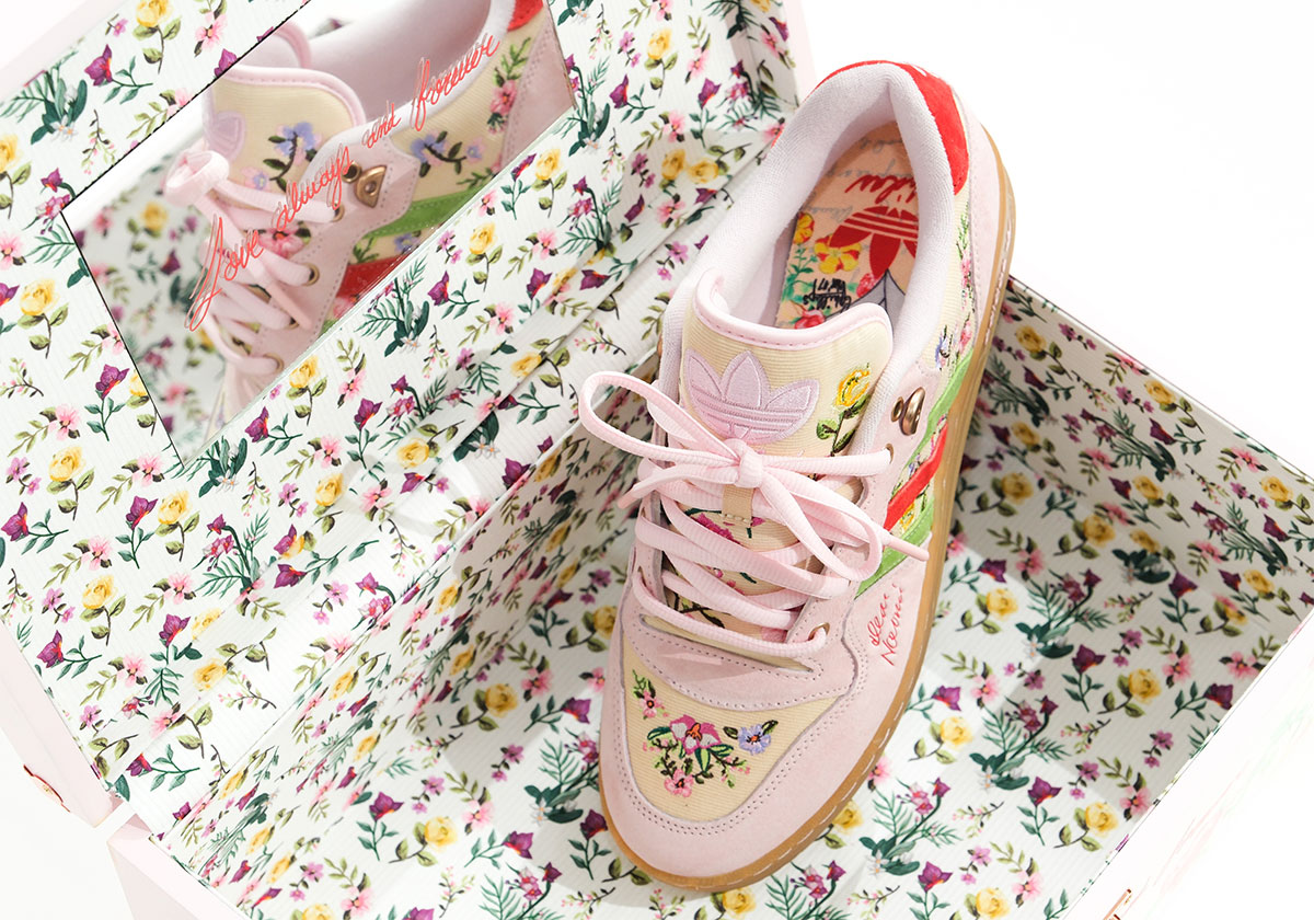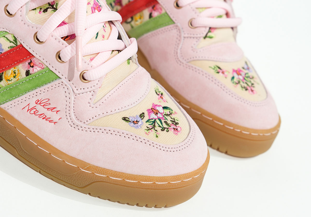 The saga began in 2023 with a colorful tribute to grandma’s couches across the globe, decorated with floral tapestries and packaged inside custom shoeboxes. For 2025, Unheardof’s founder Phil Lipschutz applies a soft palette of pink and cream with delicate flowers adorning the toe-box and mid-foot panel beneath the green and fuchsia pink stripes.