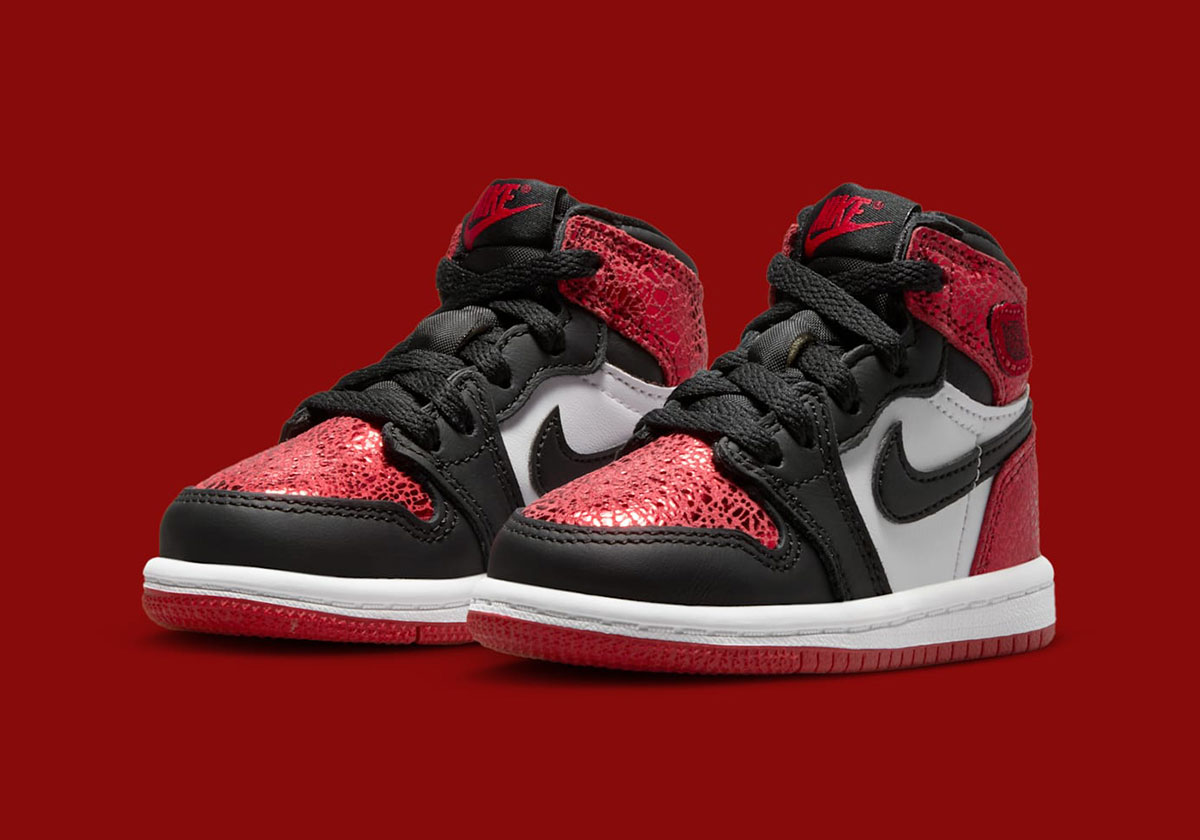 Spinning off of the “Bred Toe” from 2018 may undercut that historical lean, but this colorway is likely best understood as a halfway point between the OG “Bred” and “Black Toe.” In that way, though it doesn’t carry the “Reimagined” subhead, still the air of reinterpretation is alive and well, adding crackled leather finishes and an embossed metalWings logo.