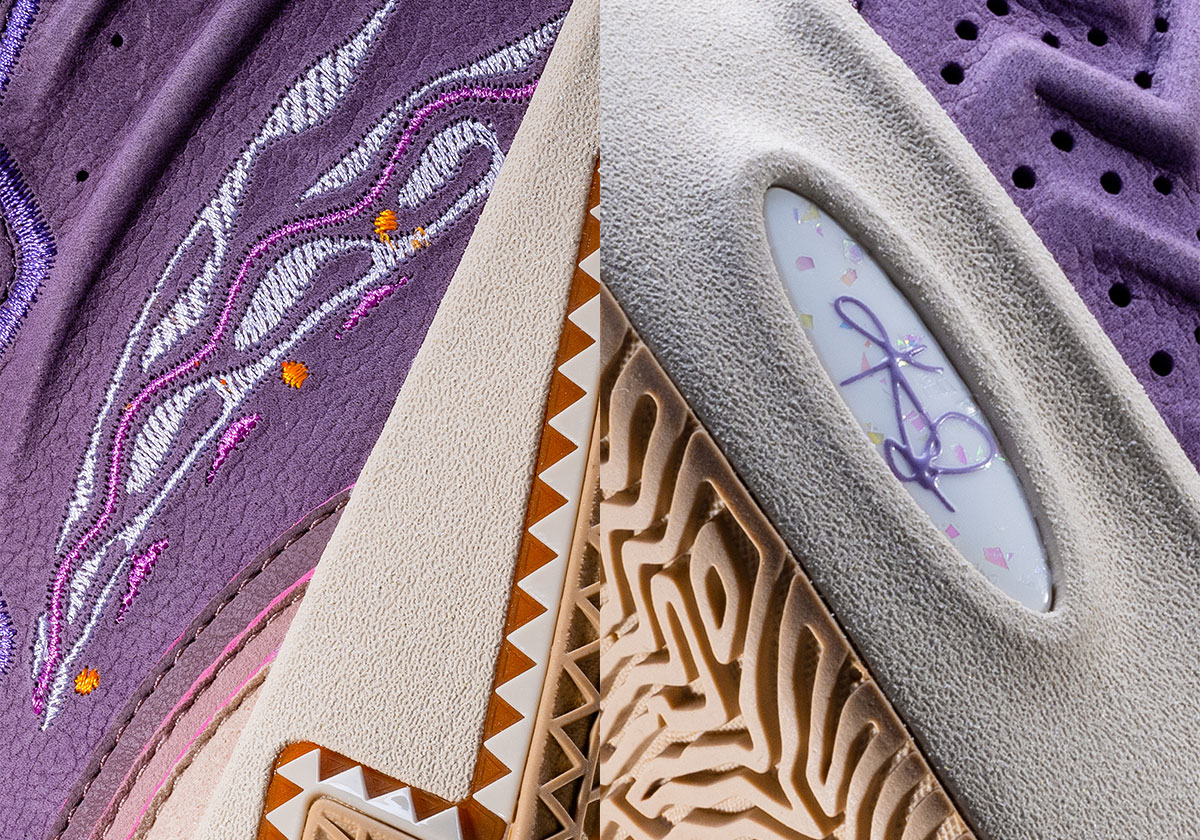 Equally eye-catching is the heel design, showcasing a litany of embroidered icons, including a new interpretation of “KAI” that runs vertically through that section. The outsole also carries through much of that abstract geometry, working in a yin-yang heart and a proud proclamation into its herringbone traction (“I Am My Own Muse, The Descendant Of The Lakota Nation.”)