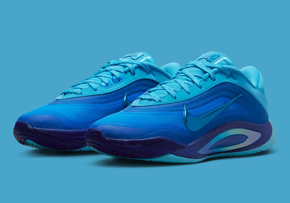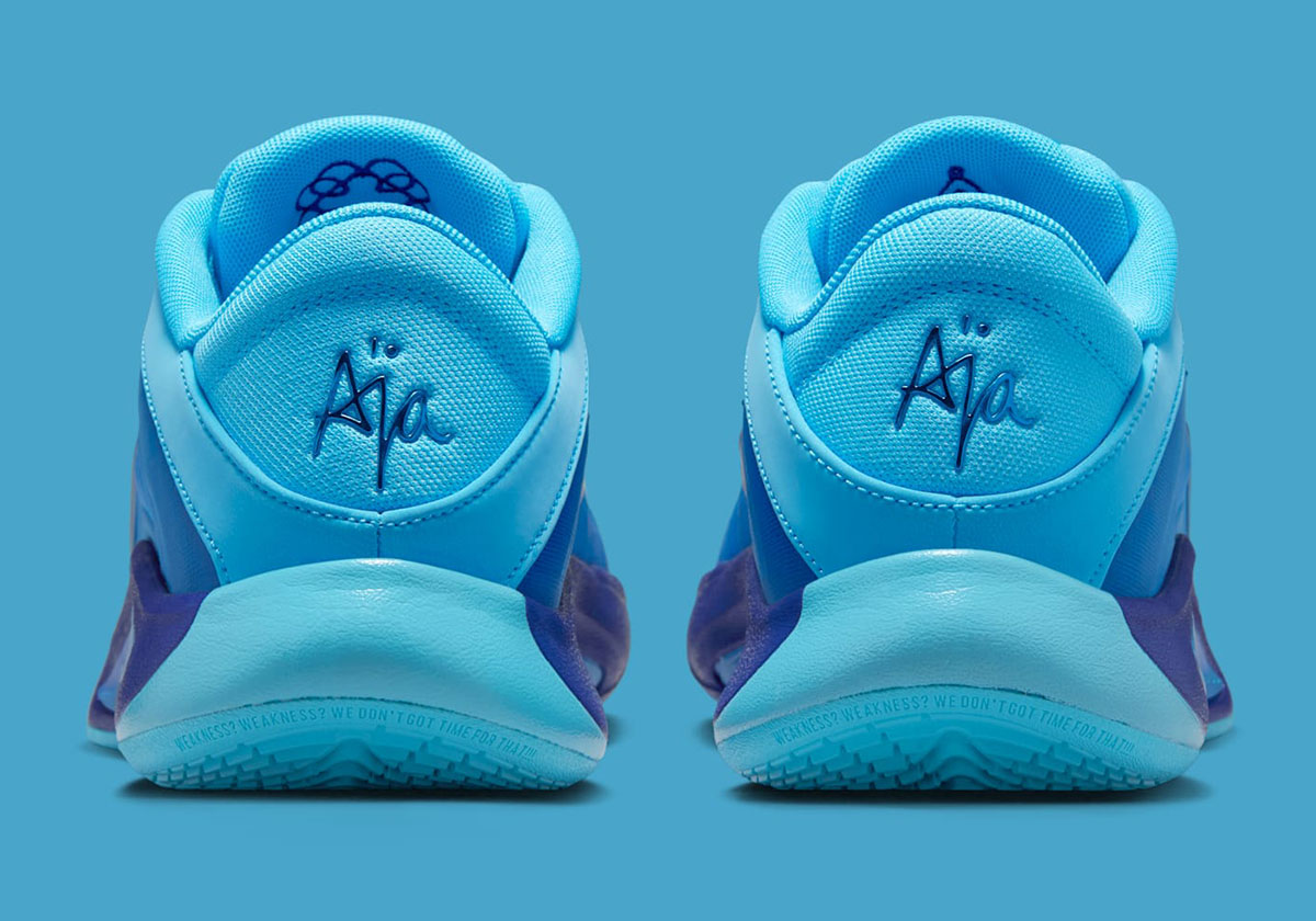 Moving onto the “Indigo Girl” A’One, the colorway is inspired by A’ja’s childhood nickname and bright-blue energy. Moreover, in 2021, A’ja published a video called The Indigo Child on The Players’ Tribune describing the racism she experienced as a child (and how it inspired her to be a role model for Black girls). Dark “Blue Fury” treatments account for most of the base, while upper portions and outsole appear in lighter “Photo Blue.”