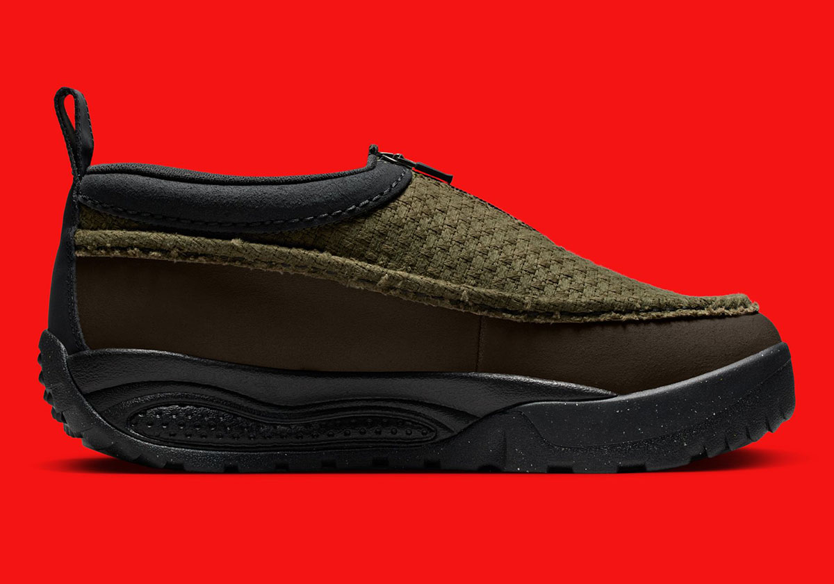 Next up for the moccasin-inspired outdoor shoe is a fresh style featuring a woven Medium Olive upper, marking the first time the Izy has moved away from its all-suede construction during its renewed run. The mudguard is built from Dark Chocolate suede, while cracked black leather wraps the collar. The midsole (shared with the ACG Rufus) comes in Off Noir, and the outsole reveals a bright red interior for a welcome pop of color.