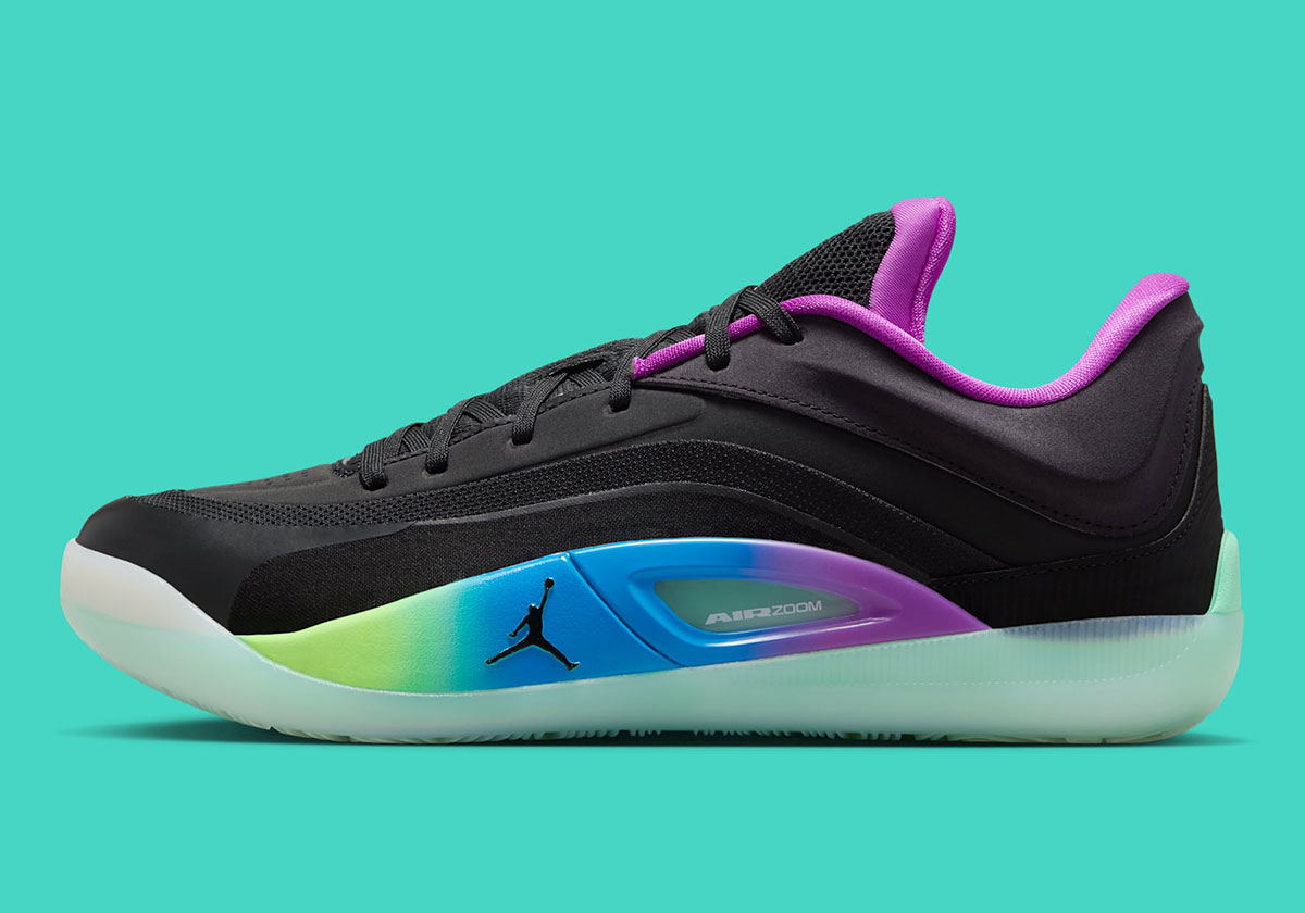 Officially, the familial look was absent from the Zion 3, but the sparkling aura that Zion alludes to there is on full display with his latest model. A rainbow iridescent pattern paints the containment surrounding the full-length Air Zoom unit, mirrored with a bright purple sock-liner.