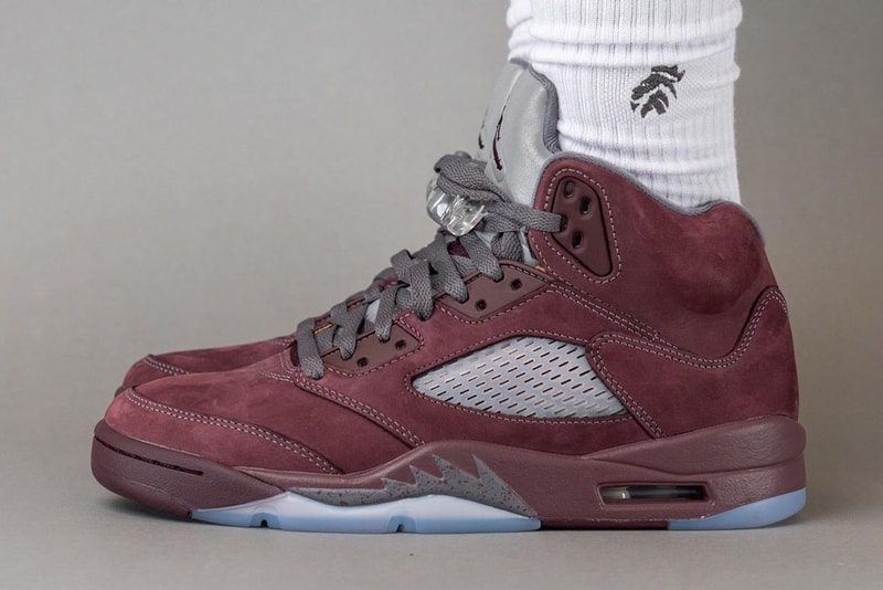 Update: After a brief on-foot look at a laceless pair of the Air Jordan 5 "Burgundy" popped up, YankeeKicks has provided a detailed breakdown of the shoe. It comes with laces in a metallic silver while boasting a bold "Burgundy" across its design. Release is now expected to take place on August 12 via Nike SNKRS and select retailers at a price of $225 USD.Update: Following retro rumors that surfaced at the end of 2022, a first glance at the upcoming Air Jordan 5 "Burgundy" has arrived -- albeit without its laces. As expected, a "Deep Burgundy" has covered a majority of the sneaker's upper with a soft suede finish. Additional details -- including silver metallic accents -- stay true to the sneaker's original form. September 9 remains the expected release date with a $225 USD price tag attached to the pair. For more information about this pair, be sure to check out our initial coverage below. View this post on Instagram A post shared by Knowing Kicks (@knowing_kicks)Original Story: The Air Jordan 5 had quite an eventful 2022 as it was produced in collaborative form alongside CLOT, PSG and hip hop mogul DJ Khaled and saw nostalgic colorways like the "Green Bean" return to the frontlines. And now that those are in the rearview mirror, the Jordan model already has its eyes set on delivering the heat in 2023, and the latest to be brought to our attention is a retro release of the Air Jordan 5 "Burgundy" colorway.Originally during the AJ 5's impressive run in 2006, the understated installment is set to make its way back to the shelves with all of its original design cues. Buttery suede upper panels are styled in a "Deep Burgundy" hue which is reminiscent of aged wine, and this is contrasted by "Flint Grey" shoe laces and reflective tongues. Lace toggles will have the usual see-through construction and the tongues will be fitted with Jumpman logos that are dressed in the pair's titular shade. Spiky molds on the midsoles feature more "Flint Grey" accents while the bottoms are done up with icy constructions.Mark your calendars for a September 9, 2023 release and expect these to retail for $225 USD.In other news, Air Jordan 9 "Light Olive" official images have popped up. Click here to view full gallery at Hypebeast