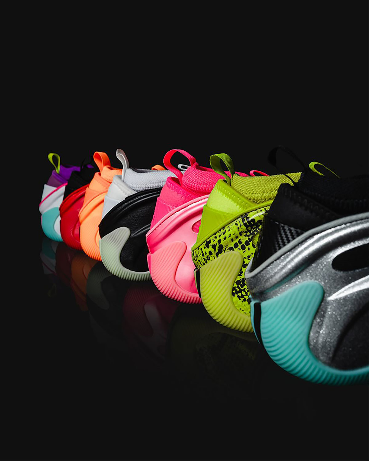 In this cadre of new looks, the easiest to digest are the “Red Metallic” and two tonal looks in the all-pink and the all-peach “Dynamo,” suitably lining up with some of the simplistically blocked pairs that have hit the streets already. However, there’s plenty of experimentation on display as the silhouette looks to its next chapter. The middlemost pair showcases leather siding next to a white inner bootie, while a neon green switches into snakeskin exteriors and the grey/teal/black “UNO” taps into glittery patterns on its cage. Finally, NBA fanatics will likely be familiar with the last pair, an eccentric blend of royal purple, light green, and white that the Thunder’s Jalen Williams and Lu Dort have been sporting throughout their team’s playoff run.