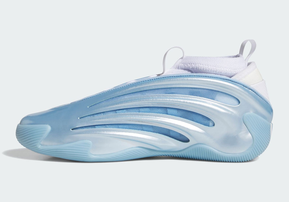 The “Ice Metallic” adidas Harden Vol 9 suits the Clippers’ City Edition uniforms with a glossy blue exterior. Curved stripe cutouts serve as the focal point, delivering a futuristic vibe aligned well with the current wave of adidas Basketball signatures (including the Anthony Edwards 2). White knit material makes up the inner bootie portion, while a radial tread pattern is utilized for grip underfoot.