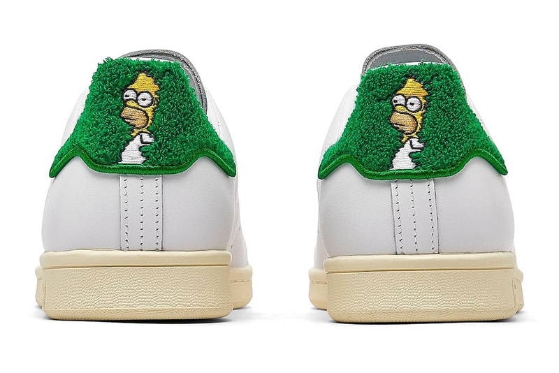 Its presentation is simple yet amusing as the Stan Smith arrives in a traditional white, off-white and green color scheme with scattered references to the hit franchise. The white leather upper features gold "Homer Simpson" text at the lateral, a portrait of Homer on the tongue, custom The Simpsons-themed sockliner and a fuzzy heel tab featuring Homer Simpson partially obscured by a bush, referencing the timeless reaction GIF and meme format of him slowly backing into the bushes.