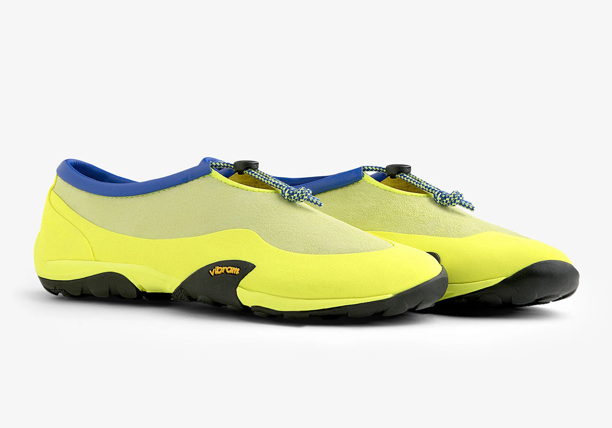 The model in question is the New Balance MT10T, here taken with a new upper that looks awfully like that of a water sock. A layer of protective synthetic material is applied to the bottom portion, while the base appears to feature some sort of suede fabric. Moving up to the foot entry point, drawstring laces are contained by leather piping for an easy on/off wear. Underfoot, the sneaker utilizes the same rugged Vibram sole seen on projects by Issey Miyake and District Vision.