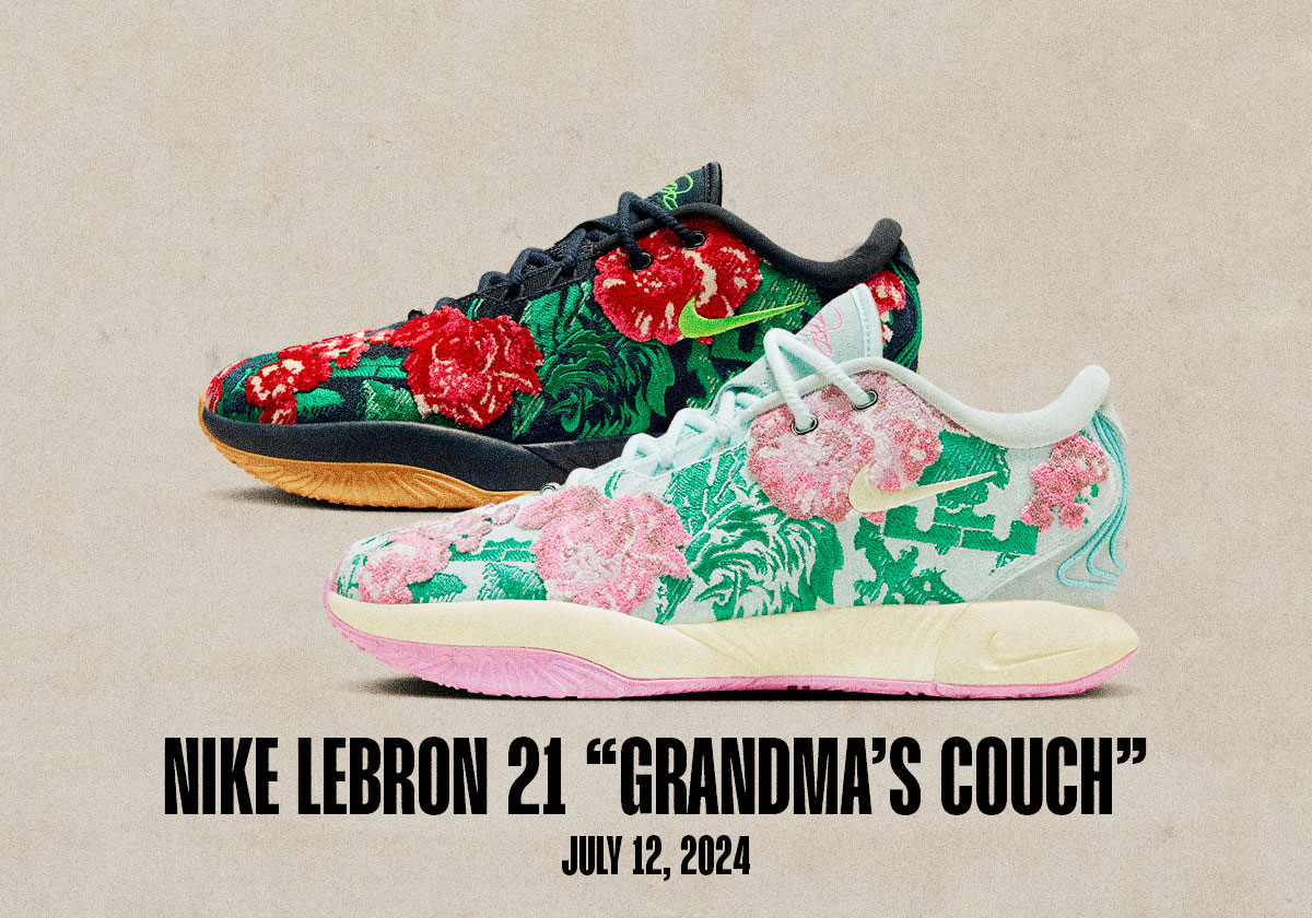 Embracing sentimental and floral themes, the Nike LeBron 21 “Grandma’s Couch” lands July 12th in two contrasting colorways.