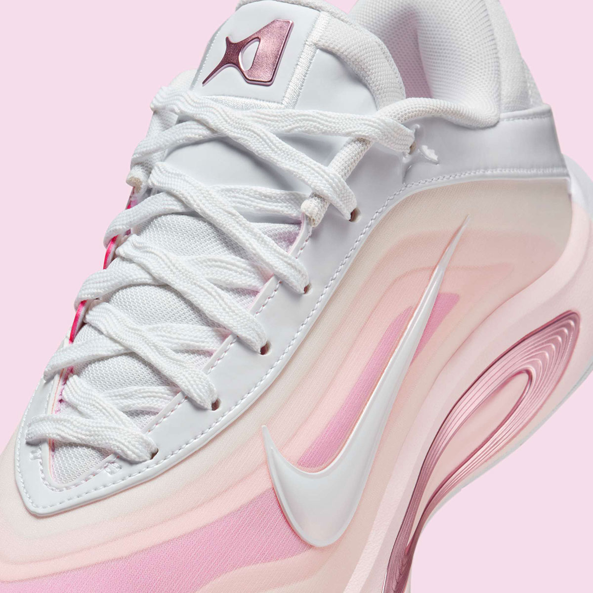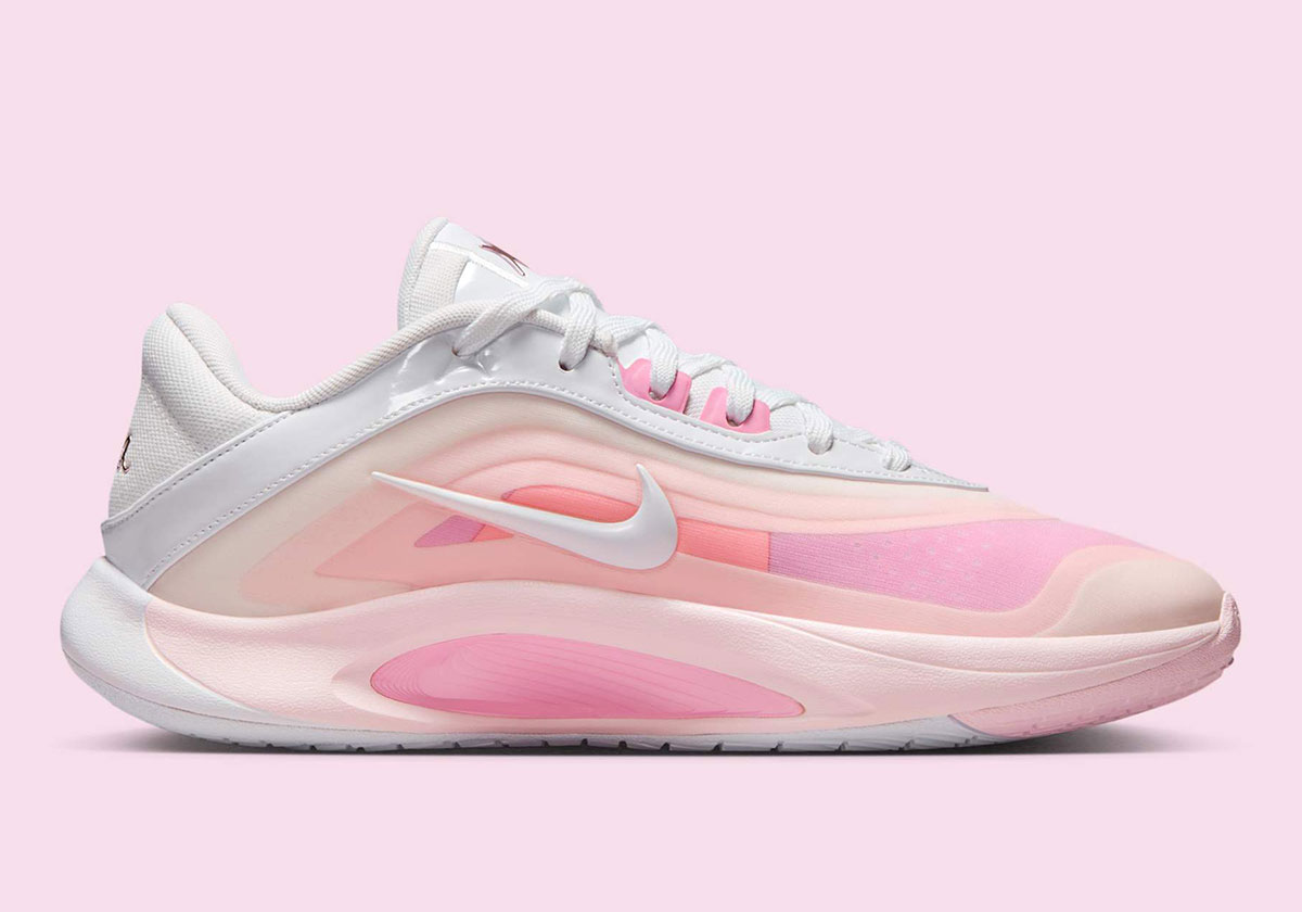 Official images reveal different shades of pink on the shoe’s pearl-inspired upper, moving from dark to light as the layers expand. White patent leather on the Swoosh logos and eyelets ties in with A’ja’s draft day shoes, complemented by metallic pink on the branded elements and lateral midsole accent.