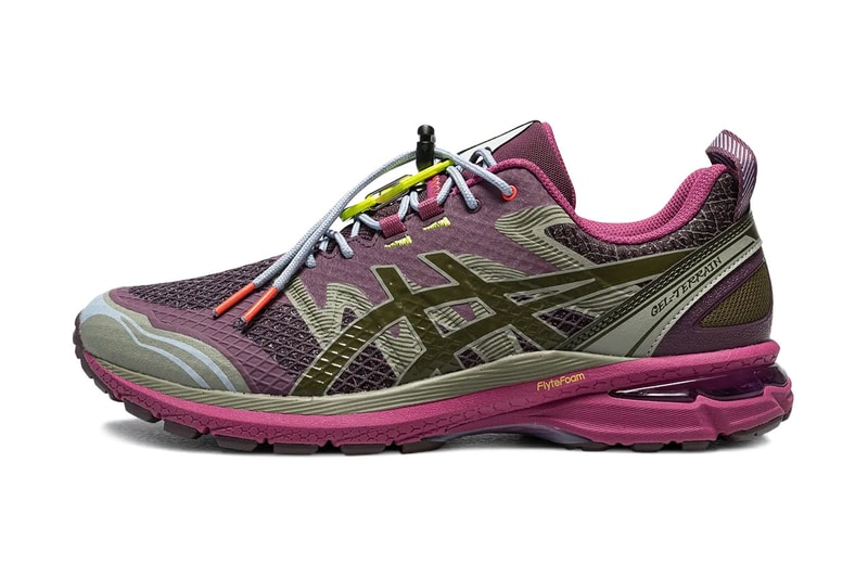 Name: Up There x ASICS GEL-TerrainColorway: Mauve/Lavender/GreySKU: 1203A520-500MSRP: $180 USDRelease Date: July 6 2024Where to Buy: ASICSAustralia-based Up There has teamed up with ASICS for the third consecutive year to launch a new collaborative sneaker, the ASICS GEL-Terrain. Drawing inspiration from the Australian bush, the sneaker features a color palette of faded mauve, lavender and grey, accented by bright acid yellow and hot red, inspired by the autumn hues of the region. The addition of a carabiner on the laces adds a hiking aesthetic, emphasizing the adventurous spirit of the design.The GEL-Terrain, known for its streamlined, aerodynamic appeal, incorporates a no-sew construction. Influences from the GEL-Fujitrabuco and GT-2000 are evident, contributing to the shoe’s popularity since its debut last fall. This model continues to highlight the versatility and innovation of ASICS' footwear line.For those interested in picking up this latest pair, the Up There ASICS GEL-Terrain is slated for a global release on July 6, with retail pricing expected to be $180 USD.Click here to view full gallery at Hypebeast
