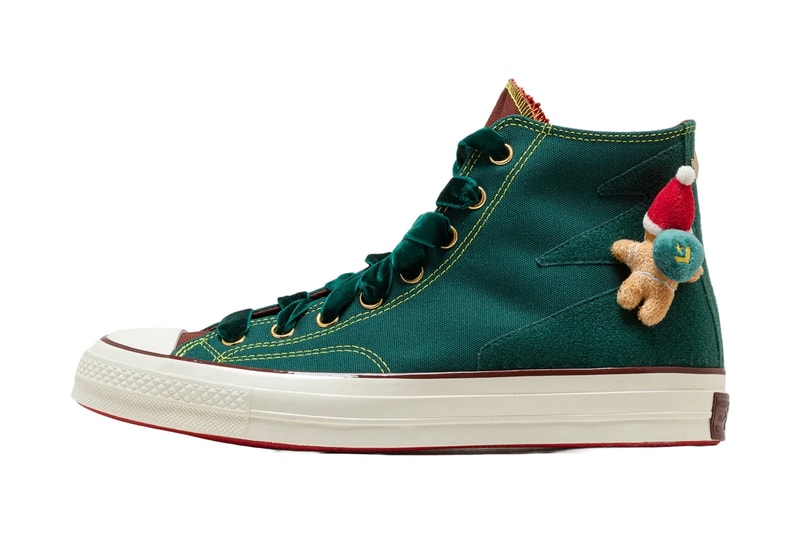 First, a "Gingerbread Man" colorway of the Chuck 70 combines a festive forest green with hints of chocolate brown at the shoe's upper. Equipped with ribbon laces in green, this special pair prominently displays a tree around the heel, with a gingerbread man plush figure sporting a Santa hat and Converse-branded bag at the left shoe's lateral heel. On the right shoe's lateral heel, this character is attached via Velcro. Golden stars rest at the heel of the collar while the medial's All-Star patch has a gingerbread man hanging onto it.