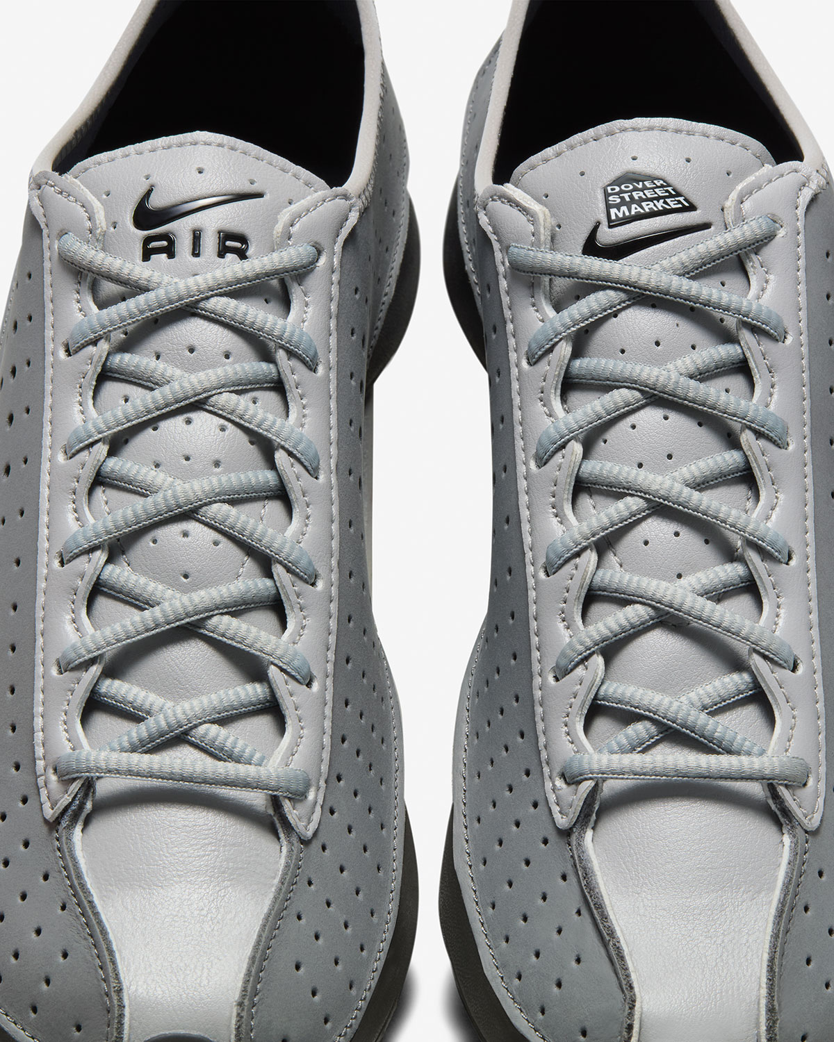 The Rei Kawakubo founded Dover Street Market presents its spin on the model, presented three ultra-sleek takes generated by hyper black, white, and smoke grey colorways. The uppers are built with perforated suede panels spelled by leather lace collars and liners, while the molded Air sole sits pretty in black. The logo lock-up of the Swoosh and the DSM hut appears on the left tongue and insoles.