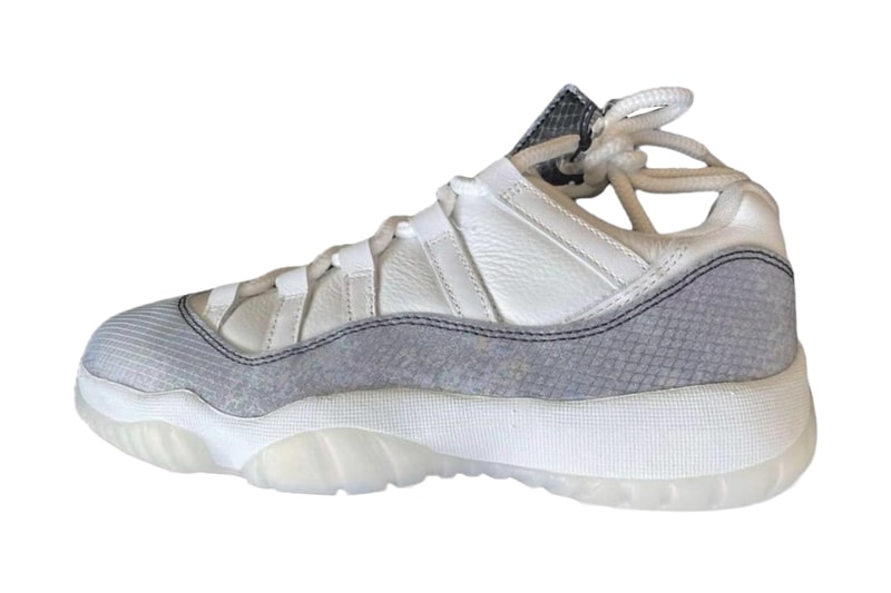 The first look to surface from next year's "Year of the Snake" collection from Jordan Brand is an Air Jordan 11 Low colorway. Our limited preview of the shoe notably sees it appear with a snakeskin mudguard in place of the silhouette's typical patent leather finish. This gray element wraps around the otherwise white sneaker, which then leans on a tumbled leather at its uppermost level.