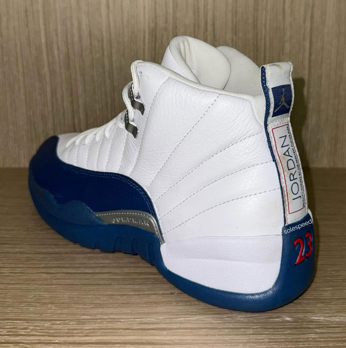 Detailed images of the upcoming French Blue 12s have surfaced via @solespeed4image, showing a design consistent with the original 2004 release. Tumbled white leather makes up the upper, complemented by pebbled “French Blue” leather on the toe/mudguard sections. Metallic silver eyelets, blue tongue stitching, and red hits on the outsole, spine, and heel “23” text sum up the rest of the look.