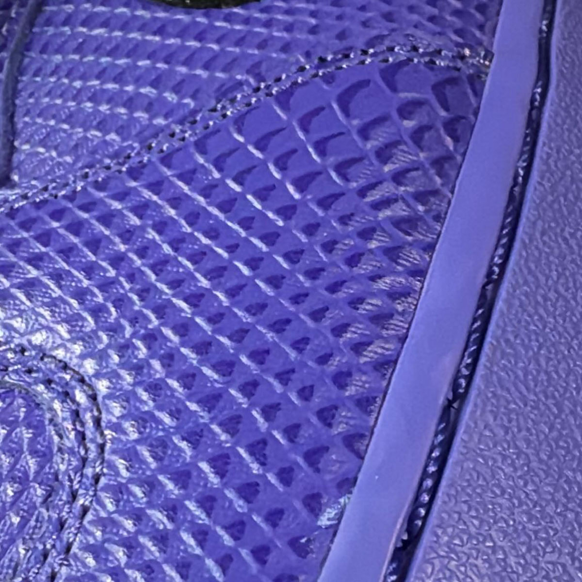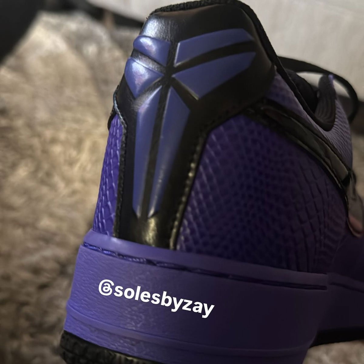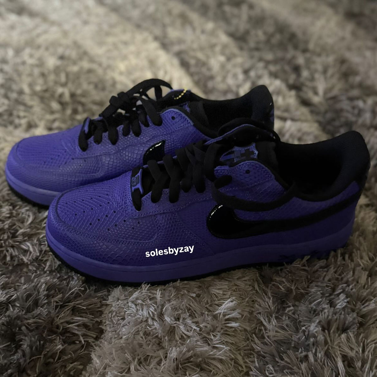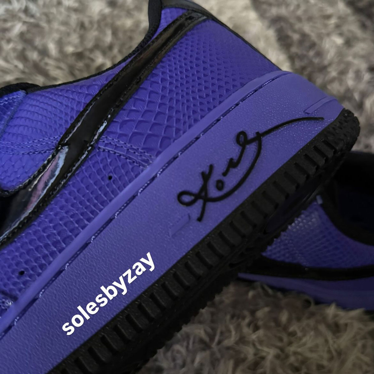 We’ll state up top that the pair depicted in these in-hand shots is, in fact, distinct from the earlier shown Kobe Air Force 1 “Court Purple” despite the stark visual similarities. Most apparent in distinguishing this three-headed link-up is the jeweled black Swoosh that cuts across the snakeskin surface, paired with jet black trim as you work to the rear.