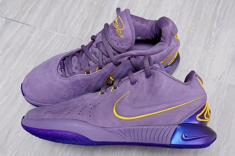 At the end of last month, LeBron James took to Instagram to showcase some in-action shots of him with his newest silhouette with the Swoosh: the Nike LeBron 21. It has yet to be revealed by Nike Basketball officially, though James has returned to Instagram to repost an early in-hand image of another colorway of the sneaker, a Lakers-esque "Violet Dust."In our closest look yet, the aforementioned purple hue dresses a majority of the nubuck upper. Its low-top shape is highlighted by the golden embroidery that crafts each side's Swooshes, the tongue's signature detail and the heel's geometry. Adding to the pair, an iridescent finish appears at the heel with a strong purple supporting the sneaker at the outsole.While Nike has not officially revealed LeBron James' new silhouette for the 2023-24 NBA season just yet, look for it to be showcased soon as this "Violet Dust" pair is currently expected to launch on October 14 via Nike and select Nike Basketball retailers at a price of $200 USD. View this post on Instagram A post shared by ? (@kingjames)Looking for more updates from the footwear space? We've got you covered. The Nike Air Force 1 Low WP -- the shoe's new waterproof iteration -- has been outfitted in a monochromatic gray finish.Click here to view full gallery at Hypebeast