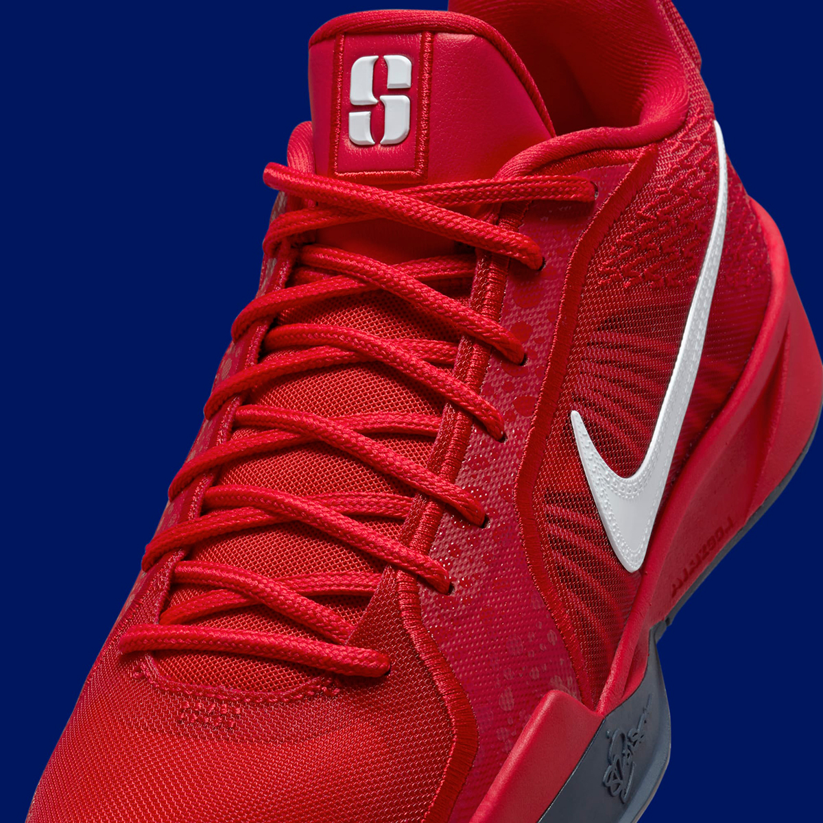 The Sabrina 2 comes with a bold all-red upper, but upon closer inspection, the ubiquitous safari pattern is lightly layered onto the lace collar. The patriotic red persists throughout the upper, adorning the embroidered texture at the heel, the plush interior, and the midsole that houses the forefoot Zoom and Cushlon 3.0 foam. Beneath it all is a dark obsidian, while white colors in the Swoosh and the surrounding Sabrina iconography.