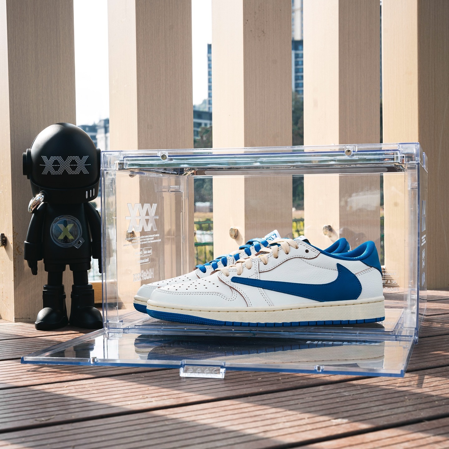 The gallery below shows a design consistent with what’s been previewed thus far. The shoe features a white leather upper, save only for Fragment’s hallmark “Military Blue” shade on the reverse Swoosh and backtab. The tongue and midsole deliver a neo-vintage edge in “Sail,” enhanced by chalked edges throughout the top half. The Wings logo is stitched onto the backtab in white, subtle black text dots the medial side of the midsole, and Cactus Jack/Fragment logos appear on the left and right heels, respectively.
