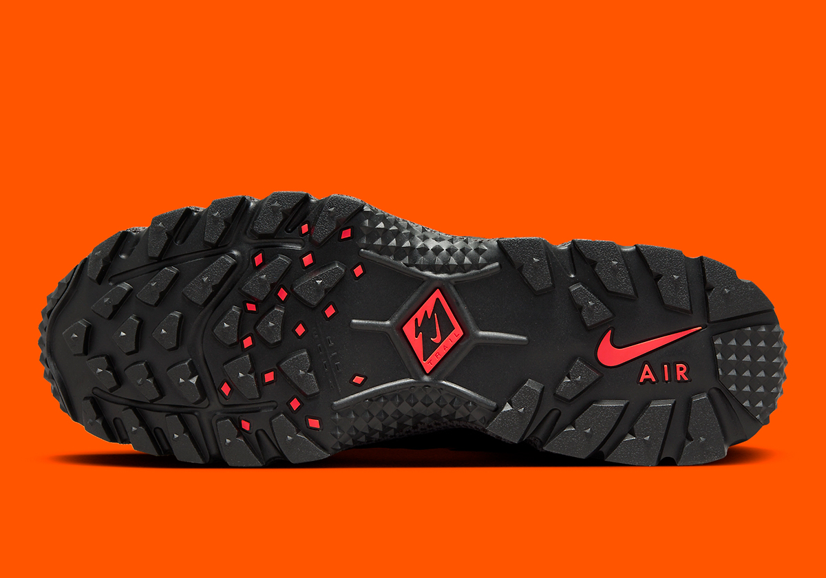 Infused with a heavy amount of pitch-dark panels, both the textile-treated sole unit and the upper’s connecting overlays are dipped in a pure jet-black tint. Stretching onto the laces and the mesh base layer, just beneath a muted red hue peeks through the textile upper while profile swooshes bring the mid-foot back to its midnight aesthetic. Elsewhere, the model borrows the “Hyper Crimson” highlights of the ACG Air Mada for a titular assortment of orange mid-foot straps that gleam with crimson-red piping.