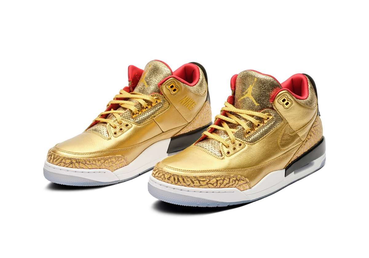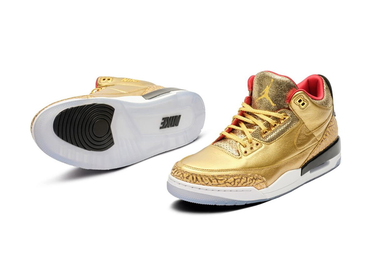 Coated in a premium gold foil, the noteworthy colorway sports “University Red” and jet-black accents at the inner lining and midsole with a completely translucent tread underfoot. Appearing with stitched profile Swooshes – a staple for Hatfield’s recent wave of AJ3s – the right heel tab sports the logo of Spike Lee’s 40 Acres and A Mule Filmworks production company.