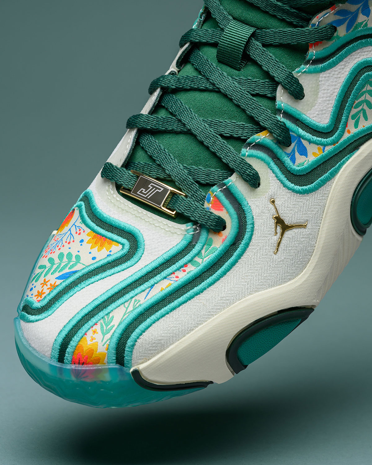 As part of that aforementioned preview, we hit on an identically titled “Welcome to the Garden” Tatum 3, set for wide release on October 10th. A closer inspection of the floral patterns on either shoe reveals a lighter arrangement on the colorway featured herewith additional gilded detailing throughout the profile nodding to championship pedigree setting these further apart.